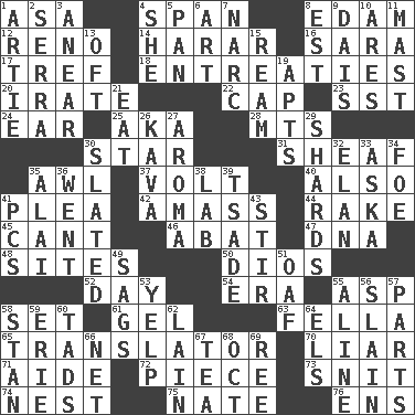 ACROSS 1. White ___ sheet 4. Connect, as a bridge 8. Dutch treat 12. Former U.S. Attorney General Janet 14. Ethiopian city, capital of Harari 16. "Two Mules for Sister ____" 17. Not kosher 18. Pleas 20. Feeling or showing extreme anger 22. Head covering 23. Fast jet (abbr.) 24. Ewer handle 25. Alias (abbr.) 28. Mountains (abbr.) 30. Play the lead 31. Archer's quiver 35. Leather borer 37. Electrical Unit 40. In addition 41. Entreaty 42. Collect or gather 44. Libertine 45. Patter 46. Blind as ____ 47. Heredity factor (abbr.) 48. Locates 50. "Vaya con ____" 52. 24 hours 54. Period 55. Cleo's killer 58. Arrange properly for use 61. Set 63. Chap (slang) 65. Interpreter 70. One who doesn't tell the truth 71. Assistant 72. Part 73. In a ____ (agitated or irritated) 74. Egg locale 75. Nathan's nickname 76. Followers of ems DOWN 1. Nick name for Arthur 2. Father Junipero _ 3. Approach 4. A female animal or person 5. Baking dish 6. Tate display 7. Drug cop 8. Eastern Standard Time (abbr.) 9. Raised platform 10. Ancient Greek god of war 11. Vertical spar for supporting sails 13. Often (poetically) 15. 480, 500 or 516 sheets of paper 19. Flats, for short 21. Erode 26. Polynesian shrub of the pepper family 27. Odor 29. Broken pieces 30. Scheduled 32. Flair 33. "____ silly question..." 34. Enemy 35. Jai ____ 36. Gone 38. Experiment locale 39. Sadhe (variant) 41. Personal Computers (abbr.) 43. Move through with a circular motion 49. Sinks 51. Clumsy lout 53. Sharp bark 55. Place in a line 56. Killed 57. Pieces 58. Comedian Laurel of Laurel & Hardy 59. 4th largest of the Great Lakes 60. Small boys 62. (Had) reclined 64. Raised railways 66. Remaining after all deductions 67. Afternoon social gathering 68. Sep. follower 69. Portuguese money of account (variant)