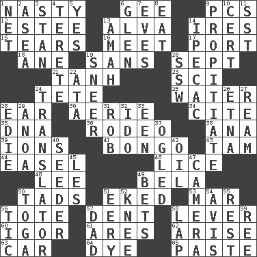 ACROSS 1. Difficult 6. Unit of force equal to gravity 9. Personal Computers (abbr.) 12. First name in cosmetics 13. Inventor's middle name 14. Angers 15. Pulls into pieces 16. Confront 17. Left side of a ship or aircraft 18. A saturated hydrocarbon 19. Without 20. Back-to-school mo. 21. Hyperbolic tangent 23. _-fi 24. Wig 25. Wetness 28. Hearing organ 30. Nest on high 34. Quote 35. Heredity factor (abbr.) 36. Cowboy competition 38. Santa ___, CA 39. Charged atoms 41. Beat drum 43. Scottish cap 44. Artist's stand 46. Louse (plural) 48. Area sheltered from the wind 49. Actor Lugosi 50. Bits 51. Made supply last 53. Third mo. 56. Haul 57. Gouge 58. Crowbar 60. Russian composer Stravinsky 61. Ancient Greek god of war 62. Ascend 63. Automobile 64. Color 65. Thick mixture DOWN 1. Remaining after all deductions 2. Toward the sea 3. Comedian Laurel of Laurel & Hardy 4. Cylindrical with tapered ends 5. Affirmative reply 6. Small, secluded valley 7. Nights before holidays 8. Erode 9. Appease 10. Foregone conclusion 11. Fast jet (abbr.) 13. Housemaid 14. Medicinal drug used to evoke vomiting 19. Scornful expression 20. Compass dir. 22. _ moment's notice (2 wds.) 24. Interpreter 26. Inactive volcano in Sicily 27. 480, 500 or 516 sheets of paper 28. Singer Brickell 29. Small Philippine buffalo 31. Director Reiner 32. Wedding promise 33. Car or cant ending 37. Stared at amorously 40. Sowing specialist 42. Lubricate 45. French article 47. Device for capturing images 49. Stakes 50. Ancient Roman robe 51. Suggestive of the supernatural 52. Leg joint 54. Advice 55. State of inaction 56. Nervous spasm 57. June honoree 58. Pet locale 59. To sift