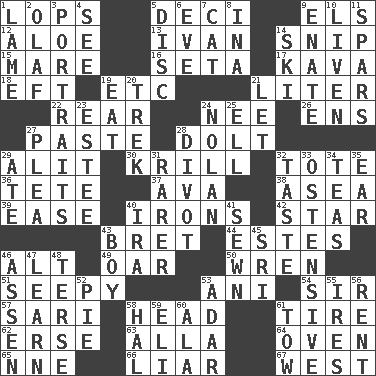 ACROSS 1. Chops off 5. Tenth: prefix 9. Raised railways 12. _ vera 13. _ the terrible 14. Clip 15. Female horse 16. Bristle 17. Polynesian shrub of the pepper family 18. Bank Draft (abbr.) 19. And so on (abbr.) 21. 61 cubic inches 22. Bring up, as a child 24. Born 26. Followers of ems 27. Thick mixture 28. Stupid person 29. Set down 30. Shrimp-like planktonic crustaceans 32. Haul 36. False hair 37. Actress Gardner 38. At sea 39. Relaxation 40. Metal shackles 42. Play the lead 43. Cy Young winner Saberhagen 44. _____ Park, CO 46. Keyboard modifier key 49. Boat paddle 50. Songbird 51. Not well drained, as in land 53. Cuckoo 54. Title for a knight 57. Indian skirt 58. Froth on beer 61. Hoop that covers a wheel 62. Celtic language 63. Silent film actress Nazimova 64. Baking chamber 65. Compass dir. 66. One who doesn't tell the truth 67. Compass direction DOWN 1. Unable to walk 2. Norwegian king 3. Likenesses of persons 4. Observe 5. Plate 6. Night before a holiday 7. Domesticated feline 8. _ tizzy (2 wds.) 9. Maternal 10. Make or become more lively 11. Practice fights 14. What Jean-Claude Killy likes to do 19. Erode 20. Long journey 21. Allow 23. First name in cosmetics 24. Pitcher Ryan 25. Pipe bend 27. Entreaty 28. A piece of turf (Scot.) 29. Had dinner 31. More uncommon 32. Clothes sense 33. Clearly or manifestly demonstrative 34. Afternoon social gatherings 35. Hearing organ 40. Retirement account (abbr.) 41. Stitched 43. Male child 45. Indian title of respect (Mr.) 46. NE Netherlands city 47. Memorize 48. Laconic 52. Sliced dessert 53. The sixth month of the Jewish calendar 55. Angers 56. Monthly bill 58. Actor Linden 59. Biblical high priest 60. Insect wing 61. Pull behind