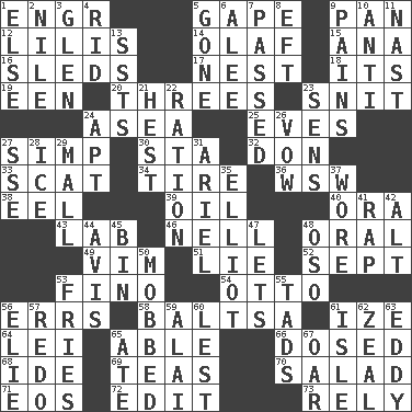 ACROSS 1. Engineer (abbr.) 5. Open wide 9. Baking dish 12. Ms. Damita and namesakes 14. Norwegian king 15. Santa ___, CA 16. Bobsleighs 17. Egg locale 18. ___ a Wonderful Life 19. Car or cant ending 20. Threesomes 23. In a ____ (agitated or irritated) 24. Toward the sea 25. Nights before holidays 27. Simple or foolish person 30. R.R. building 32. Spanish title 33. Leave at once 34. Become fatigued 36. Compass dir. 38. Snakelike fish 39. Petroleum 40. Mouth or opening 43. Experiment locale 46. 1994 drama film starring Jodie Foster 48. Taken by mouth 49. Zeal 51. Falsehood 52. Back-to-school mo. 53. A pale, very dry sherry 54. "Beetle Bailey" pooch 56. Blunders 58. Greek mezzo-soprano Agnes 61. Ending with capital 64. Flowery wreath 65. Competent 66. Administered medicine 68. Binary compound 69. Afternoon social gatherings 70. Vegetable dish 71. Greek goddess of the dawn 72. Prepare for publication 73. Have trust in DOWN 1. Otherwise 2. The longest river in the world 3. Small, secluded valley 4. To free from 5. Went 6. Toward shelter 7. Went by 8. Newt 9. Aches 10. Against 11. Political cartoonist Thomas 13. Fast planes 21. Command 22. Food allowance for one day 23. Elected reps. 24. Fitting 26. Promise 27. Compass dir. 28. Frozen water 29. Shopping center 31. Satellite of Uranus 35. American author Paul (1891-1958) 37. Had on 41. Reproach for some lapse or misdeed 42. The first octave above the treble staff 44. Deliberation 45. Storage container 47. Allows 48. Bear (Spanish) 50. Crowded into 53. Strips of potato fried in deep fat 55. Bits 56. Writer Wiesel 57. Do over again 59. Jai ____ 60. For fear that 61. Capri or Wight 62. Ardor 63. Whirlpool 65. Had dinner 67. Boat paddle