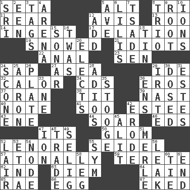 ACROSS 1. Bristle 5. Keyboard modifier key 8. Three (prefix) 11. Posterior 12. Advice 13. Friend of Pooh 14. Eat 17. Accusation by an informer 19. Overwhelmed 21. Foolish or stupid persons 22. Of or related to the anus 23. Elected rep. 24. Plant excrement 27. At sea 29. Binary compound 32. Bodily heat indicating an inflammation 34. Music discs 36. Greek god of love 37. NW Algerian seaport 38. Teat (slang) 39. Political cartoonist Thomas 40. Observe 41. "Barney Miller" actor Jack 42. First name in cosmetics 43. Compass dir. 44. Fly high 46. Begley and Asner 47. It is 50. Seize upon or latch onto something 52. Poe poem 55. A glass for beer 57. Without tonality 59. Cylindrical with tapered ends 62. Working for oneself (abbr.) 63. South Vietnam president (1954) 64. (Had) reclined 65. Actress Charlotte 66. Ovum 67. Made supply last DOWN 1. Indian title of respect (Mr.) 2. Car or cant ending 3. Labels 4. Sports stadium 5. "___ Maria" 6. Ms. Damita and namesakes 7. Sadhe (variant) 8. Musical group of three 9. Carrot, for example 10. Charged particles 12. Find the sum of 15. Underwater navigation system 16. It was, poetically 18. Metal container 20. Opts 24. Biscuitlike quick bread 25. Composer Copland 26. Food holder 28. Goodbye (Sp.) 29. Feeling or showing extreme anger 30. Administered medicine 31. _____ Park, CO 33. Single 35. Moe Howard, for one 36. Followers of ems 42. Eat (away) 45. Set down 47. Electrically charged atom 48. Buy and sell 49. Major League Baseball Commissioner Bud 51. Haggard of country music 52. Den 53. Inactive volcano in Sicily 54. Thickened enlargement 55. Symbol (abbr.) 56. Path through which fluid escapes 58. Part of a journey 60. Neckwear 61. Conclude