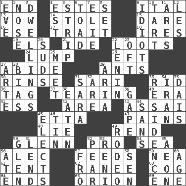 ACROSS 1. Conclude 4. _____ Park, CO 9. Slanted text style (abbr.) 13. Promise 14. Took without asking 15. Have the gumption 16. Compass dir. 17. Distinguishing feature 18. Angers 19. Raised railways 21. Binary compound 22. Plunders 24. Mass 26. Lizard (obsolete) 27. Remain 29. Pismires 30. Wash lightly 31. Indian skirt 33. To free from 36. Label 37. Separating forcefully 40. Epoch 41. Double-curved letter 42. Length times width 43. Slender Brazilian palm 45. Singer James 47. Aches 48. Untruth 49. Tear apart 50. American astronaut and politician John 52. Adept person 54. Ocean 56. Actor Baldwin 57. Eats 59. Teachers' org. 61. Portable shelter 62. The wife of a rajah (variant) 63. Gear tooth 64. Conclusions 65. Constellation of myth 66. Compass dir. DOWN 1. First lady 2. Sense of smell 3. Homes 4. Eastern Standard Time (abbr.) 5. Long narrow piece of something 6. Frog relative 7. Writer Wiesel 8. Put into a specified state 9. Foolish or stupid persons 10. Small pie 11. Ancient Greek god of war 12. French article 20. Beer foam 22. Soviet premier 1918-24 23. Often (poetically) 25. Confront 27. Johnson of "Laugh-In" 28. Prejudice 29. Roberta Peters solo 31. "Two Mules for Sister ____" 32. "We ___ not amused" (Victoria) 33. Home 34. SW Asia republic 35. Raised platform 38. Eroded 39. Stare wonderingly 44. Without 45. Opts 46. Metal container 49. Cowboy competition 50. Small, secluded valley 51. Grant temporary use of 52. Lightbulb-shaped fruit 53. Painter Guido (1575-1642) 55. A really long time 56. Had dinner 57. Back 58. Elected rep. 60. Personal question