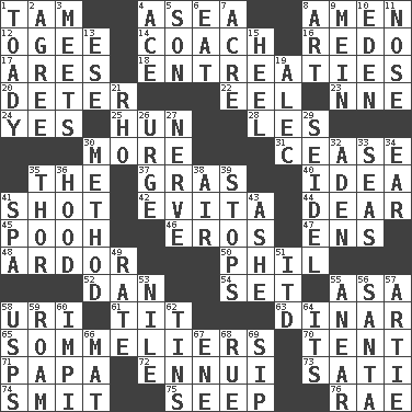 ACROSS 1. Scottish cap 4. Toward the sea 8. So be it 12. Double curve, resembling the letter S 14. Team commander 16. Do over again 17. Ancient Greek god of war 18. Pleas 20. Prevent from occurring 22. Snakelike fish 23. Compass dir. 24. Consenting reply 25. Attila the _ 28. French article 30. Greater amount 31. Desist 35. Definite Article 37. Pate de foie ____ 40. The main thing one is thinking about 41. Went for two points 42. Webber/Rice musical 44. Letter starter 45. "Silly old bear" 46. Greek god of love 47. Followers of ems 48. Zeal 50. Silvers or Donahue 52. One of the 12 tribes of Israel 54. Put into a specified state 55. White ___ sheet 58. RI univ. 61. Teat (slang) 63. Middle Eastern gold or silver currency 65. Wine waiters 70. Portable shelter 71. Dad 72. World-weariness 73. Suttee (variant) 74. Stricken, poetically 75. Ooze 76. Actress Charlotte DOWN 1. Sycophant 2. Match 3. Confronts 4. Adept person 5. Male offspring 6. Consume 7. 1/640 square mile 8. Nonscientific branch of learning 9. Chow _ 10. Paradise 11. Characteristic smell of wine 13. Compass dir. 15. The bottom of a shoe or boot 19. Actor Baldwin 21. 17th letter of the Greek alphabet 26. Goad 27. Boldness 29. A glass for beer 30. Mode 32. Arabian gulf 33. Oceans 34. Hearing organ 35. Son of Odin 36. Parka part 38. Atmosphere 39. Closes up, plugs up 41. Health resort 43. American tennis player Robert 49. Pace 51. It would 53. Mediterranean tributary 55. Approach 56. Before Barbara or Clara 57. Nick name for Arthur 58. United States Postal Service (abbr.) 59. Wander 60. Body of Kaffir warriors 62. Metal containers 64. It is 66. Floor covering 67. Compass dir. 68. Regret 69. Small drink