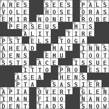 ACROSS 1. Ancient Greek god of war 5. Observes 9. Friends 13. Short-tailed, large-bodied rat 14. Stockings 15. Mouths or openings 16. Arab leader 17. Music written for nine 18. Loose flowing garment 19. Son of Zeus who helped slay Medusa 21. Mountains (abbr.) 22. Set down 23. Hoop that covers a wheel 24. Pacific Standard Time (abbr.) 27. Raised railways 28. Ancient Roman robe 29. Toward the future 31. Floor covering 32. Lodging establishments 36. Habitations of wild animals 37. Australian flightless bird 38. A blast of a horn 39. Fast planes 40. Adept person 41. Come out of 42. "Tell ____ the Marines!" 44. Adept person 46. Eastern Standard Time (abbr.) 47. At sea 48. Coop moms 50. Parent Teacher Assoc. 51. More impudent 54. Capital of Western Samoa 56. Unconcealed 58. Small, secluded valley 60. SW Asia republic 61. Fine (Spanish) 62. Billionth: prefix 63. Gouge 64. Bits 65. Frozen precipitation DOWN 1. "___ Maria" 2. Play 3. Writer Wiesel 4. Father Junipero _ 5. Yells 6. Immeasurably long periods of time 7. Compass dir. 8. Arrange properly for use 9. Likenesses of persons 10. Came up 11. Experiment locale 12. Compass dir. 17. Famous astronaut Armstrong 20. Downhill vehicle 21. Russian fighter aircraft 23. Small child 24. Writing tablets 25. "______ My Girl" (Turtles hit) 26. Portable shelter 28. The 19th letter of the Greek alphabet 30. Aide 31. Madame (abbr.) 33. Sense of smell 34. Common sense 35. Proofreading order 37. Environmental prefix 40. _ moment's notice (2 wds.) 41. Charged particles 43. Beverage made from leaves 44. N Egypt peninsula 45. State of inaction 47. Bee-related 49. Public displays of written messages 51. Transmit 52. Liveliness 53. Western Nevada city 54. Help 55. Before (prefix) 56. Often (poetically) 57. By way of 59. Immediately