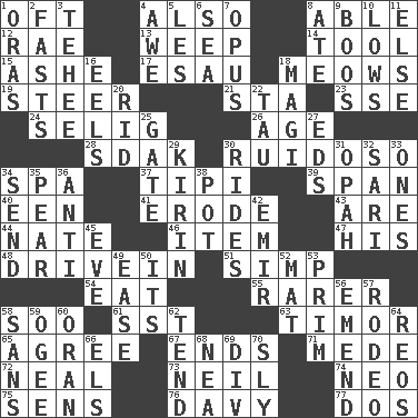 ACROSS 1. Often (poetically) 4. In addition 8. Competent 12. Actress Charlotte 13. Shed a tear 14. Utensil 15. American tennis player Robert 17. Son of Isaac 18. Catcalls? 19. Navigate 21. R.R. building 23. Compass dir. 24. Former Milwaukee Brewers owner Bud 26. Mature 28. Neighbor of Neb. 30. Boisterous (Brazilian Portuguese) 34. Health resort 37. Native american tent (variation) 39. Connect, as a bridge 40. Car or cant ending 41. Eat (away) 43. "We ___ not amused" (Victoria) 44. Nathan's nickname 46. A distinct part 47. Part of HMS, perhaps 48. Popular '50s hangout 51. Simple or foolish person 54. Ingest 55. Less widely known 58. "Barney Miller" actor Jack 61. Fast jet (abbr.) 63. The easternmost of the Lesser Sundas 65. Match 67. Extremities 71. Ancient Persian 72. Anneal 73. Famous astronaut Armstrong 74. Modern: prefix 75. Elected reps. 76. _ Jones' Locker 77. Two (Sp.) DOWN 1. Mouths or openings 2. Goes without food and/or water 3. Giggle 4. Deep reverence 5. French article 6. Ocean 7. Musical composition 8. Had dinner 9. Scornful sounds 10. Coldest temperatures 11. Otherwise 16. Snakelike fish 18. Wise men 20. To free from 22. The 19th letter of the Greek alphabet 25. Yard entry 27. Begley and Asner 29. Japanese brewing company 30. Amusement-park features 31. Brightly colored fish 32. Indian skirt 33. Singles 34. Post 35. Lightbulb-shaped fruit 36. Against 38. Plant holder 42. Arab leader 45. Night before a holiday 49. Comfort 50. ___ a Wonderful Life 52. Floor covering 53. Demure 56. Make improvements or corrections to 57. Cowboy competition 58. Without 59. Double curve, resembling the letter S 60. NW Algerian seaport 62. Be inclined (to) 64. Vintage cars 66. Raised railways 68. Teachers' org. 69. HTML Container Element 70. Stealthy