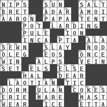 ACROSS 1. Pinches, bites 5. Player for Phoenix 8. Table seasoning 12. Cy Young winner Saberhagen 13. The sixth month of the Jewish calendar 15. Mine, in Marseilles 16. Composer Copland 18. Dad 19. Portable shelter 20. Cooking vessel 22. Preparing or cooking with lard 24. Whine 26. Electrically charged atom 27. South American Indian 28. Parent Teacher Association (abbr.) 29. Wing 32. Stitched 35. Kill 37. Dreamland 38. Cassini of fashion 39. Greek goddess of the dawn 40. Single time 41. Victory 42. High mountains 43. Distinctive style or manner 44. Put into a specified state 45. Raised railways 46. Otherwise 49. Actor Linden 50. Letter starter 51. Of or relating to Laos or its people 55. Nervous spasm 56. Dormintory (informal) 57. Uhlan (variant) 59. Popular sodas 63. One of the Great Lakes 64. Female horse 65. Vertical spar for supporting sails 66. Erode 67. Frozen water 68. Singer James DOWN 1. Basketball assoc. 2. Lyricist Gershwin 3. For each 4. Halting 5. Plant excrement 6. Hereditary estate 7. California wine valley 8. Smooth fabric 9. So be it 10. Yearn 11. Teat (slang) 14. Noteworthy scarcity 17. Part of speech 21. Affectionate concern, for short 23. ___ good deed 25. Artist's stands 28. Went by 29. Singer Murray 30. Event scenes 31. Arabian gulf 32. Sty mamas 33. Writer Wiesel 34. Gone 36. Trim (branches) 40. Conquer 42. Plant genus of onion and garlic 45. Consume 47. Allow 48. Ketch in the Levant 49. Home run 51. Old wives' tales, e.g. 52. Roberta Peters solo 53. Jai ____ 54. Drug cop 56. Morning condensation 58. Born 60. Krazy ___ of comics 61. Eastern Standard Time (abbr.) 62. R.R. building