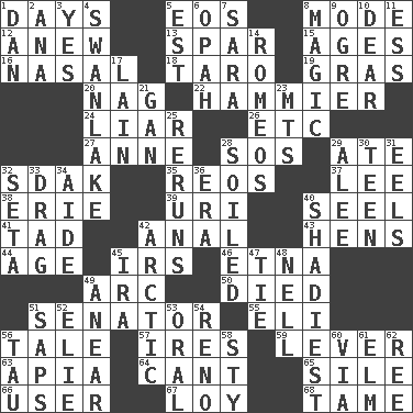ACROSS 1. 24-hour periods 5. Greek goddess of the dawn 8. Method 12. Afresh 13. Coast Guard woman 15. Grows older 16. Relating to the nose 18. Edible starchy tuberous root 19. Pate de foie ____ 20. Tired old horse 22. More given to overacting 24. One who doesn't tell the truth 26. And so on (abbr.) 27. Queen of England 1702-14 28. Distress signal 29. Had dinner 32. Neighbor of Neb. 35. Vintage cars 37. Area sheltered from the wind 38. One of the Great Lakes 39. RI univ. 40. Sew up the eyelids of hawks and falcons 41. Small boy 42. Of or related to the anus 43. Coop moms 44. Grow older 45. Big collection agency 46. Inactive volcano in Sicily 49. Curve 50. Passed on 51. Elected representative 55. Biblical high priest 56. Falsehood 57. Angers 59. Crowbar 63. Capital of Western Samoa 64. Patter 65. Drop; flow; fall 66. One who makes use of a thing 67. Myrna of the movies 68. Not wild DOWN 1. One of the 12 tribes of Israel 2. Santa ___, CA 3. Affirmative reply 4. Tchaikovsky ballet 5. Eastern Standard Time (abbr.) 6. Brightly colored fish 7. "Two Mules for Sister ____" 8. Mysterious quality of enchantment 9. Legendary monster 10. Letter starter 11. Double-curved letter 14. Lover boys 17. (Had) reclined 21. Separate the seeds from cotton 23. Mountains (abbr.) 25. Summer TV shows 28. Dirtied 29. Toward shelter 30. Adolescent 31. Snakelike fish 32. Bristle 33. To trail on the ground 34. Helper 36. Epoch 40. Most dubious of character or honesty 42. Northern region 45. Retirement account (abbr.) 47. Make a knot 48. 1994 drama film starring Jodie Foster 49. Approach 51. Plant excrements 52. Writer Wiesel 53. Spoken 54. Former U.S. Attorney General Janet 56. The 19th letter of the Greek alphabet 58. Filthy place 60. By way of 61. Shade tree 62. To separate or throw off