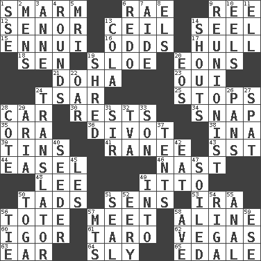 ACROSS 1. Excessive but superficial compliments 6. Actress Charlotte 9. To separate or throw off 12. Sir (Sp.) 13. To provide with a ceiling 14. Sew up the eyelids of hawks and falcons 15. World-weariness 16. Likelihood 17. Frame or body of a ship 18. Elected rep. 19. A type of plum 20. Immeasurably long periods of time 21. Capital of the state of Qatar 23. Fr. "Yes" 24. Russian ruler of old 25. Obstructs or blocks passage 28. 4-wheeled motor vehicle 30. Musical pauses 34. Fastener 35. Mouth or opening 36. A piece of turf (Scot.) 38. _ tizzy (2 wds.) 39. Metal containers 41. The wife of a rajah (variant) 43. Fast jet (abbr.) 44. Artist's stand 46. Political cartoonist Thomas 48. Area sheltered from the wind 49. "Tell ____ the Marines!" 50. Small amounts or degrees 51. Elected reps. 53. Lyricist Gershwin 56. Lug 57. Rendezvous 58. Place in a line 60. Russian composer Stravinsky 61. Edible starchy tuberous root 62. Viva Las _ 63. Hearing organ 64. Stealthy 65. Peak District village in England DOWN 1. Compass dir. 2. Not women's 3. Singer Murray 4. Periods in a boxing match 5. Medical imaging device (abbr.) 6. Redecorate 7. Assistant 8. Raised railways 9. One who advocates reunion 10. Snakelike fish 11. Pipe bend 13. Root beer relative 14. Yells 19. Tear up 20. Greek goddess of the dawn 22. Rowing implement 24. Interpreter 26. Zero-star reviews 27. Petty quarrel 28. ____ d'Azur (French Riviera) 29. Operatic vocal solo 31. Title for a knight 32. Federal power corp. 33. Boy, to dad 37. Portable shelters 40. Sowing specialist 42. Ingest 45. French article 47. Dirtied 49. To the inside or interior of 50. Ancient Roman robe 51. Lick closed 52. Suggestive of the supernatural 54. Port city in Latvia 55. Of or related to the anus 56. Neckwear 57. Mountains (abbr.) 58. "___ Maria" 59. Compass dir.