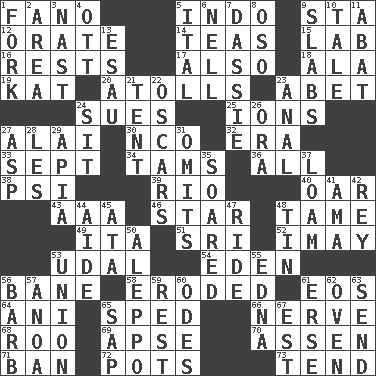 ACROSS 1. Papal veil 5. Southeast Asian peninsula 9. R.R. building 12. Declaim 14. Beverages made from leaves 15. Experiment locale 16. Musical pauses 17. In addition 18. According to 19. Krazy ___ of comics 20. Ringlike coral islands and reefs 23. Collude with 24. Takes to court 25. Charged particles 27. Jai ____ 30. Non-commissioned officer (abbr.) 32. Epoch 33. Back-to-school mo. 34. Scottish caps 36. 100% 38. 23rd letter of the Greek alphabet 39. _ de Janeiro 40. Rowing implement 43. Auto club (abbr.) 46. Play the lead 48. Docile 49. Call ___ day 51. Indian title of respect (Mr.) 52. "If ____ say so..." 53. Allodial 54. Locale of original sin 56. Object of repulsion 58. Eaten away 61. Greek goddess of the dawn 64. Black tropical American cuckoo 65. Moved rapidly 66. Impudent aggressiveness 68. Friend of Pooh 69. Domed church section 70. NE Netherlands city 71. Prohibit 72. Cooking vessels 73. Be inclined (to) DOWN 1. Tined utensil 2. Type of rug 3. Political cartoonist Thomas 4. Baseball player Mel 5. Slanted text style (abbr.) 6. 1994 drama film starring Jodie Foster 7. Small ungulate mammals of Africa 8. Bear (Spanish) 9. Thick slices 10. Story 11. Blind as ____ 13. Son of Isaac 21. Portable shelter 22. Motion picture awards 23. Of or related to the anus 24. Be seated 26. Mouth or opening 27. Cleo's killer 28. French article 29. Capital of Western Samoa 31. Leaves out 35. Flew 37. Rich soil 41. Nanny (var.) 42. Marina Del _, California 44. Helper 45. "One Day ___ Time" 47. Travel on or in a vehicle 48. Shallow baking pan 50. City in Syria 53. The state of being joined or united 55. Pulitzer Prize-winning author Ferber 56. Sharp remark 57. Small Philippine buffalo 59. Repose 60. Lyric poems 61. Celtic language 62. Baking chamber 63. Transmit 65. Plant excrement 67. Eastern Standard Time (abbr.)