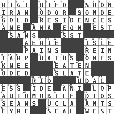 ACROSS 1. Swiss mountan, "Queen of the Mountains" 5. Passed on 9. Within a short period 13. SW Asia republic 14. Scent 15. Something which is sent 16. Aureate 17. Homes 19. One (Scot) 20. Nursemaid (var.) 21. Period of immesurable duration 22. Eastern Standard Time (abbr.) 23. Without 25. Fast jet (abbr.) 26. Nest on high 30. Capri or Wight 34. Aches 35. It's straight from the horse's mouth 36. Canvas cover 39. Profane or obscene expressions 42. Singles 43. Leg joint 44. Ingested 46. Wrote a lyric poem 47. Chalkboard 48. To free from 51. Allodial 54. Double-curved letter 57. Binary compound 58. Cuckoo 60. Chop off 62. Car 65. "Vaya con ____" 66. Actors Connery and Penn 67. Southern CA. univ. 68. Pismires 69. Jane of fiction 70. Lick closed 71. Compass direction DOWN 1. Capital of Latvia 2. Metal shackles 3. An organ shaped like a helmet 4. Working for oneself (abbr.) 5. Dormintory (informal) 6. The main thing one is thinking about 7. Greek goddess of the dawn 8. Frees from moisture 9. Male offspring 10. Single time 11. Lyric poems 12. Egg locale 15. Posted 18. Two (Sp.) 20. Toward the sea 24. Slept 27. River (Sp.) 28. _ tizzy (2 wds.) 29. _____ Park, CO 30. Pressed 31. Elected rep. 32. Whopper 33. Followers of ems 36. Ring climax 37. Also 38. To separate or throw off 40. Actor Linden 41. R.R. building 45. Needle case 48. Basketball hoops 49. Wedding promise 50. Alight from a bus 52. Place in a line 53. Plunders 54. Comfort 55. Chop _ 56. Play the lead 58. Silent film actress Nazimova 59. Actress Patricia 61. Inconspicuous attention getter 63. Single 64. Frozen water 65. Fool