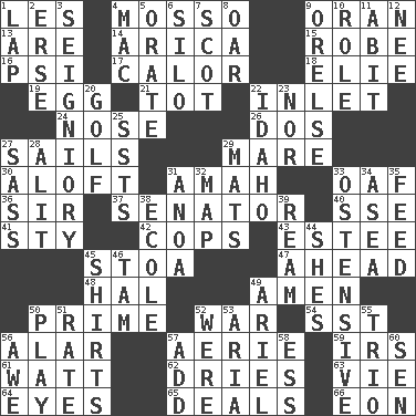 ACROSS 1. French article 4. With motion or animation 9. NW Algerian seaport 13. "We ___ not amused" (Victoria) 14. N. Chile seaport 15. Loose flowing garment 16. Air pressure measure (abbr.) 17. Bodily heat indicating an inflammation 18. Writer Wiesel 19. Oval reproductive body of a fowl 21. Small child 22. An arm off of a larger body of water 24. Olfactory organ 26. Two (Sp.) 27. Travels by water 29. Female horse 30. Upward 31. Nanny 33. Clumsy lout 36. Title for a knight 37. Legislator 40. Compass dir. 41. Filthy place 42. 911 reaches them 43. First name in cosmetics 45. Portico 47. Toward the future 48. Actor Linden 49. So be it 50. A-one 52. Armed conflict 54. Fast jet (abbr.) 56. Having or resembling wings 57. Nest on high 59. Big collection agency 61. Electrical Unit 62. Frees from moisture 63. Compete 64. Snake ____ (dice throw) 65. Allots cards 66. A really long time DOWN 1. Infant locale 2. Celtic language 3. Signiory (variant) 4. Apple computer (short form) 5. Declaim 6. Grain storage tower 7. Native of Scotland 8. Rowing implement 9. Threatening words 10. Hero or heavy, e.g. 11. "This won't hurt ____!" 12. Born 20. Eighteen holes 22. Potato state 23. Not either 25. Fast planes 27. Backtalk 28. Set down 29. Floor coverings 31. Small Philippine buffalo 32. Atlas unit 33. Clearly or manifestly demonstrative 34. Toward the sea 35. Nourish 38. Learning spot: Fr. 39. 480, 500 or 516 sheets of paper 44. "______ My Girl" (Turtles hit) 45. Upper-body garments 46. Scottish cap 49. Satellite of Uranus 50. Romp 51. Pace 52. We are 53. Roberta Peters solo 55. Musical group of three 56. Deep reverence 57. Increase 58. Curvy letter 60. Elected rep.