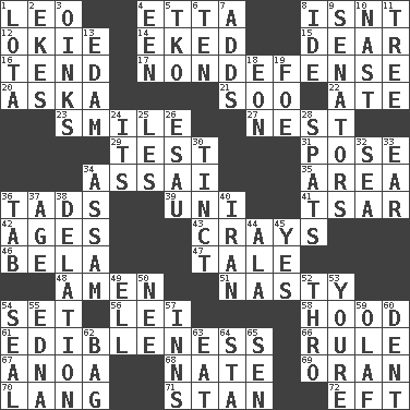 ACROSS 1. Lion 4. Singer James 8. Is not 12. Migrant worker of the '30s 14. Made supply last 15. Letter starter 16. Be inclined (to) 17. Unrelated to defense, as in spending 20. "____ silly question..." 21. "Barney Miller" actor Jack 22. Had dinner 23. Grin 27. Egg locale 29. Trial 31. Airs 34. Slender Brazilian palm 35. Type of rug 36. Bits 39. Corn or form start 41. Russian ruler of old 42. Eons 43. Trading vessels 46. Actor Lugosi 47. Lie 48. So be it 51. Thoroughly unpleasant 54. Arrange properly for use 56. Flowery wreath 58. Parka part 61. The property of being fit to eat 66. General guideline 67. Small Philippine buffalo 68. Nathan's nickname 69. NW Algerian seaport 70. Long (Scottish) 71. Comedian Laurel of Laurel & Hardy 72. Newt DOWN 1. Globular water bottle used in Asia 2. Makes supply last 3. Pig sounds 4. Car or cant ending 5. Ring climax 6. "___ Little Indians" 7. Does sums 8. Binary compound 9. Legislators 10. Political cartoonist Thomas 11. Family _ (genealogy) 13. Dutch treat 18. A really long time 19. Enemy 24. ___ a Wonderful Life 25. French article 26. He sold his birthright 28. Arguments over trivial matters 30. A color or tint 32. Ocean 33. Hearing organ 34. Indian state 36. Bar bill 37. Personal question 38. Conveyance 40. SW Asia republic 44. Chicken ___ king 45. It is so 49. Pipe bend 50. Born 52. Through, poetically 53. You are 54. Lick closed 55. Pulitzer Prize-winning author Ferber 57. Taverns 59. Norwegian king 60. Gouge 62. Container for groceries 63. Erode 64. R.R. building 65. Elected rep.