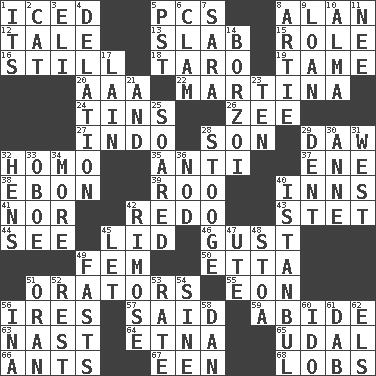 ACROSS 1. On the rocks 5. Personal Computers (abbr.) 8. Actor Alda or Thicke 12. Story 13. Broad, flat, thick piece 15. Hero or heavy, e.g. 16. Free from disturbance or agitation 18. Edible starchy tuberous root 19. Docile 20. Auto club (abbr.) 22. Chrissie's court nemesis 24. Canisters 26. Last letter of the English alphabet 27. Southeast Asian peninsula 28. Male child 29. Simpleton 32. Same (prefix) 35. Against 37. Compass dir. 38. Inky black, to poets 39. Friend of Pooh 40. Taverns 41. And not 42. Do over again 43. Proofreading order 44. Observe 45. Flaplike covering 46. Abrupt rush of wind 49. Opposite of masc. 50. Singer James 51. Speakers 55. A really long time 56. Angers 57. Stated 59. Remain 63. Political cartoonist Thomas 64. Inactive volcano in Sicily 65. Allodial 66. Pismires 67. Car or cant ending 68. Tennis shots DOWN 1. ___ a Wonderful Life 2. Domesticated feline 3. Connecticut Ivy Leaguer 4. Accusation by an informer 5. Pacific Standard Time (abbr.) 6. Burrowing marine mollusk 7. "Two Mules for Sister ____" 8. Nick name for Arthur 9. Grant temporary use of 10. _ mater 11. Born 14. Russian wolfhound 17. (Had) reclined 21. Added to 23. Nine, plus one 25. Flew 28. Moe Howard, for one 29. Undesirable depression on a surface 30. Singer Murray 31. Compass direction 32. Coop moms 33. Mitch Miller's instrument 34. Greater amount 36. Allow head to fall sleepily 40. Byzantium, centuries later 42. Full of chinks, cracks, or crevices 45. Allow 47. Shoshoni 48. Portico 49. Goes without food and/or water 51. NW Algerian seaport 52. Relief 53. Pace 54. Trig term 56. _ tizzy (2 wds.) 58. One of the 12 tribes of Israel 60. Wedding promise 61. Small moist lump or mass 62. Raised railways