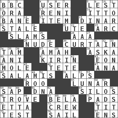 ACROSS 1. English channel? 4. One who makes use of a thing 8. For fear that 12. Mouth or opening 13. Painter Guido (1575-1642) 14. "Tell ____ the Marines!" 15. Object of repulsion 17. A distinct part 18. Middle Eastern gold or silver currency 19. Showing deterioration from age 21. Shoshoni 23. Curve 24. Criticizes harshly 26. Auto club (abbr.) 28. Naked 30. Window treatment 34. Scottish cap 37. Wet nurse 39. "____ silly question..." 40. Cuckoo 41. Japanese brewing company 43. Period of immesurable duration 44. Undercover agent 46. Wig 47. Santa ___, CA 48. Deli grouping 51. High mountains 54. Friend of Pooh 55. Type of eclipse 58. Plant excrement 61. Heredity factor (abbr.) 63. Grain storage towers 65. Collection of objects 67. Actor Lugosi 71. Writing tablets 72. Singer James 73. Ship's personnel 74. Teat (slang) 75. Trial 76. Travel by water 77. Followers of ems DOWN 1. Moves up and down 2. Naughty children 3. Lessep's creation 4. RI univ. 5. Put into a specified state 6. Compass dir. 7. Tall New Zealand timber tree 8. Cards in a Roman deck? 9. Inactive volcano in Sicily 10. Play the lead 11. Torque (variant) 16. Liveliness 18. Letter starter 20. Australian flightless bird 22. The 19th letter of the Greek alphabet 25. Neighbor of Neb. 27. _ moment's notice (2 wds.) 29. Sends forth 30. Riviera of "Kiss of the Spider Woman" 31. At sea 32. Visual representation of an object 33. Grandmother 34. Scottish caps 35. Small Philippine buffalo 36. Place where flour is made 38. "We ___ not amused" (Victoria) 42. 1994 drama film starring Jodie Foster 45. Ewer handle 49. Method 50. Electrically charged atom 52. Fluid product of inflammation 53. Sever or remove by pinching or nipping 56. Having winglike extensions 57. "The Thinker" sculptor 58. Proofreading order 59. Johnson of "Laugh-In" 60. Cooking vessels 62. Lettered men learn these first 64. Fast planes 66. Large container 68. Epoch 69. Flowery wreath 70. Leather borer