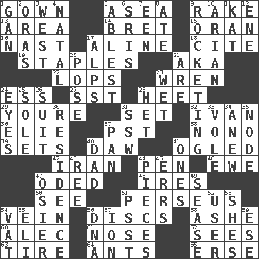 ACROSS 1. Woman's formal wear 5. At sea 9. Libertine 13. Type of rug 14. Cy Young winner Saberhagen 15. NW Algerian seaport 16. Political cartoonist Thomas 17. Place in a line 18. Quote 19. Paper fasteners 21. Alias (abbr.) 22. Chops off 23. Songbird 24. Double-curved letter 27. Fast jet (abbr.) 28. Confront 29. You are 31. Arrange properly for use 32. _ the terrible 36. Writer Wiesel 37. Pacific Standard Time (abbr.) 38. Words to Nanette 39. Puts into a specified state 40. Obsolete 41. Stared at amorously 42. SW Asia republic 44. Writing instrument 46. She-sheep 47. Wrote a lyric poem 48. Angers 50. Observe 51. Son of Zeus who helped slay Medusa 54. Distinctive style or manner 56. Plates 58. American tennis player Robert 60. Actor Baldwin 61. Olfactory organ 62. Perceives with the eye 63. Hoop that covers a wheel 64. Pismires 65. Celtic language DOWN 1. Separate the seeds from cotton 2. Mouths or openings 3. Compass direction 4. Relating to or accompanying birth 5. Most capable 6. Indian titles of respect 7. Car or cant ending 8. Had dinner 9. Shooting up abruptly 10. Believer in; advocate of (suffix) 11. Krazy ___ of comics 12. Compass dir. 17. High mountains 20. Introduce or present, as a question 21. "We ___ not amused" (Victoria) 23. Dripping 24. Snake ____ (dice throw) 25. Not divided or shared with others 26. Costume for a special activity 28. Was introduced to 30. Home 31. Compass dir. 33. Grand slam 34. Afresh 35. Thickened enlargement 37. Baking dish 40. Male parent 41. Singles 43. To separate or throw off 44. Parts 45. Blunders 47. Flexible twig of a willow tree 49. Gospel singer Marvin 51. Inconspicuous attention getter 52. One who makes use of a thing 53. "______ My Girl" (Turtles hit) 54. Large container 55. Biblical high priest 56. Heredity factor (abbr.) 57. Electrically charged atom 59. Compass dir.