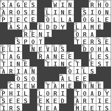 ACROSS 1. Gurus 6. Victory 9. 17th letter of the Greek alphabet 12. Came up 13. Actor's bit 14. The Jewish people; Israel 15. Part 16. Water jar 17. Stare at amorously 18. White ___ sheet 19. Whirlpool 20. Unable to walk 21. Painter Guido (1575-1642) 23. Mouth or opening 24. Specific locale 25. Laconic 28. Biblical high priest 30. Mole, birthmark 34. Capital of the state of Qatar 35. Label 36. The wife of a rajah (variant) 38. French article 39. Prong on a fork 41. A color or tint 43. Eastern Standard Time (abbr.) 44. Believer in; advocate of (suffix) 46. Lubricates 48. Bear (Spanish) 49. Toward shelter 50. Group working together 51. Not wild 53. Compass dir. 56. Silvers or Donahue 57. Australian parrot (variant) 58. Sycophant 60. Observes 61. Supplemented with great effort 62. Nick name for Arthur 63. Big collection agency 64. Beverage made from leaves 65. Confronts DOWN 1. Plant excrement 2. Operatic vocal solo 3. Moves 4. Fortification 5. Observe 6. Uncontrolled 7. In an inward manner 8. Teachers' org. 9. Frustrating wastes of time 10. Hollow 11. Single 13. Farming town in central California 14. Flew 19. Keyboard key 20. Car dealer's back yard 22. A really long time 24. Seigniories (variant) 26. "______ My Girl" (Turtles hit) 27. 90 degrees 28. Singer James 29. Den 31. Large container 32. Corn or form start 33. Elected rep. 37. Learning spot: Fr. 40. Artist's stands 42. Make a knot 45. At this time 47. Poe poem 49. Among 50. "Mermaids" star 51. Puff or smoke 52. Type of rug 54. Nathan's nickname 55. Prepare for publication 56. 23rd letter of the Greek alphabet 57. Allow 58. Scottish cap 59. Affirmative reply