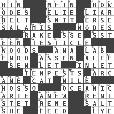 ACROSS 1. Storage container 4. Count _ (2 wds.) 8. Ribbon knot 11. Lyric poems 13. Writer Wiesel 14. One who doesn't tell the truth 15. Waist strap 16. Stricken, poetically 17. Celtic language 18. Deli grouping 21. Methods 22. Immoral or dissolute person 23. Compass dir. 25. Fast jet (abbr.) 26. Car or cant ending 29. One of the two male reproductive glands 32. Forest 34. Santa ___, CA 35. Experiment locale 38. Inside; within (prefix) 39. NE Netherlands city 41. Toward shelter 43. Elected rep. 44. Allow 45. An arm off of a larger body of water 46. Storms 50. Curve 51. One (Scot) 54. Feline 55. Mediterranean tributary 57. With motion or animation 59. Pertaining to the sea 63. Johnson of "Laugh-In" 64. Afresh 67. Painter Guido (1575-1642) 68. Proofreading order 69. French philosopher Descartes 70. Table seasoning 71. A female animal or person 72. Nourish 73. Potassium hydroxide DOWN 1. Moves up and down 2. It may be bright or harebrained 3. 1994 drama film starring Jodie Foster 4. Makes clutter 5. Shade tree 6. One more than two 7. Fish or hair follower 8. Avian creatures 9. Fertile tracts in a desert 10. Obtain by seizing forcibly or violently 12. Play the lead 14. Lion 19. Floor protectors 20. Mamie's husband 21. Cartoonist voice _ Blanc 23. Trig term 24. Skim 26. She-sheep 27. Immeasurably long periods of time 28. Connecting point 30. Clothes sense 31. Style 33. Do not 36. Silent film actress Nazimova 37. Fermented drink made from hops 39. _ mater 40. Back-to-school mo. 42. And so on (abbr.) 45. Small island 47. Environmental prefix 48. Overwhelmed 49. Nervous spasm 51. Collect or gather 52. _ pole 53. First name in cosmetics 56. Hearing organs 58. Put into a specified state 60. Actress Patricia 61. Inwardly 62. Quote 64. Sandy's bark 65. Born 66. Compass dir.