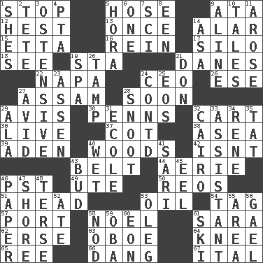 ACROSS 1. Obstruct or block passage 5. Flexible conduit 9. "One Day ___ Time" 12. Command 13. At one time in the past 14. Having or resembling wings 15. Singer James 16. It's straight from the horse's mouth 17. Grain storage tower 18. Observe 19. R.R. building 21. Natives or inhabitants of Denmark 22. California wine valley 24. Corporate head (abbr.) 26. Compass dir. 27. Indian state 28. Within a short period 29. Opinion 30. Actor Sean's family 32. Heavy open wagon 36. Moving, as bait 37. Small bed 38. At sea 39. Arabian gulf 40. Forest 42. Is not 43. Waist strap 44. Nest on high 46. Pacific Standard Time (abbr.) 49. Shoshoni 50. Vintage cars 51. Having the leading position 53. Lubricate 54. Label 57. Left side of a ship or aircraft 58. Christmas carol 61. "Two Mules for Sister ____" 62. Celtic language 63. Mitch Miller's instrument 64. Leg joint 65. Portuguese money of account (variant) 66. Mild oath, euphamism for damn 67. Slanted text style (abbr.) DOWN 1. "______ My Girl" (Turtles hit) 2. Wig 3. Clearly or manifestly demonstrative 4. Parent Teacher Assoc. 5. Israeli folk dance 6. Single 7. _-fi 8. Car or cant ending 9. Place in a line 10. Stories 11. Came up 14. White ___ sheet 19. Health resort 20. Pack (down) 21. Spanish title 23. NE Netherlands city 24. Continued (abbr.) 25. Greek goddess of the dawn 27. Enthusiastic 28. Snout, nose 29. Insect wing 31. Learning spot: Fr. 32. Capital of Egypt 33. Aide 34. French philosopher Descartes 35. Make lace 40. Soggy 41. Indian skirt 43. Partially opened flower 45. Snakelike fish 46. Some stationery 47. Dinah or Pauly 48. Laconic 52. Had dinner 53. Cassini of fashion 55. Type of rug 56. Highlander 58. Lower and raise head in agreement 59. Chief or king in Benin or Nigeria 60. A really long time 61. What Jean-Claude Killy likes to do