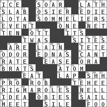 ACROSS 1. Frozen water 4. Fly high 8. Thin strip of wood or metal 12. Thick slice 14. Flexible twig of a willow tree 16. Singer Brickell 17. Globular water bottle used in Asia 18. Wine waiters 20. Incident 22. Single 23. Fish or hair follower 24. Nine, plus one 25. Baseball player Mel 28. It is 30. It was, poetically 31. Locates 35. "We ___ not amused" (Victoria) 37. (Had) reclined 40. Wig 41. Scent 42. Ferber et al. 44. Patter 45. Assign a rank or rating to 46. Comfort 47. Mouth or opening 48. Naughty children 50. Tiny particle 52. Consume 54. Pet locale 55. Quiet! 58. Adept person 61. Director Reiner 63. Giggle 65. Complicated, petty procedures 70. 1994 drama film starring Jodie Foster 71. The main thing one is thinking about 72. Off-Broadway awards 73. Travel by water 74. Confront 75. Drop; flow; fall 76. Egg _ yung DOWN 1. Small island 2. Garlic unit 3. Eroded 4. Mayday 5. Bear (Spanish) 6. Direct toward a target or goal 7. San ____ (Riviera town) 8. Flowery wreath 9. An important port of Yemen 10. Hoop that covers a wheel 11. Behest 13. Bar 15. Painter Guido (1575-1642) 19. Allows 21. Pull behind 26. Story 27. Sadhe (variant) 29. "Cheers" or "Ellen" 30. Cylindrical with tapered ends 32. Rend 33. Inactive volcano in Sicily 34. Arrange properly for use 35. The sixth month of the Jewish calendar 36. Roll call or roster of names 38. _ tizzy (2 wds.) 39. Rhinal 41. Globe 43. Bristle 49. "Two Mules for Sister ____" 51. Elect 53. "Corrida" creature 55. Archer's quiver 56. Sun: prefix 57. Phone greeting 58. Demure 59. Travel on an animal 60. Double curve, resembling the letter S 62. Moves up and down 64. Followers of ems 66. Floor protector 67. Cards in a Roman deck? 68. Snakelike fish 69. Compass dir.