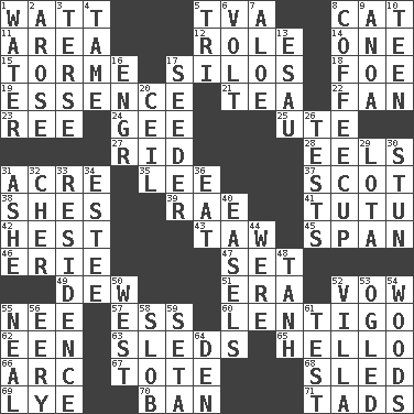 ACROSS 1. Electrical Unit 5. Federal power corp. 8. Feline 11. Length times width 12. Hero or heavy, e.g. 14. Single 15. Singer Mel 17. Grain storage towers 18. Enemy 19. Substance 21. Afternoon social gathering 22. Avid follower 23. Portuguese money of account (variant) 24. Turn to the right 25. Shoshoni 27. To free from 28. Snakelike fish 31. 1/640 square mile 35. Area sheltered from the wind 37. Native of Scotland 38. "______ My Girl" (Turtles hit) 39. Actress Charlotte 41. Ballerina skirt 42. Command 43. The 23rd letter of the Hebrew alphabet 45. Connect, as a bridge 46. One of the Great Lakes 47. Arrange properly for use 49. Morning condensation 51. Period 52. Solemn pledge 55. Born 57. Curvy letter 60. Small, flat, pigmented spot on the skin 62. Car or cant ending 63. Bobsleighs 65. Phone greeting 66. Curve 67. Carryall 68. Downhill vehicle 69. Potassium hydroxide 70. Prohibit 71. Small amounts or degrees DOWN 1. Wetness 2. Came up 3. Laconic 4. Docile 5. Three (prefix) 6. Electrical Unit 7. Medicinal plant 8. Java holder (2 wds.) 9. Small Philippine buffalo 10. Adolescent 13. He sold his birthright 16. Engineer (abbr.) 17. Sowing specialist 20. To provide with a ceiling 26. Trials 29. Globular water bottle used in Asia 30. Make senseless or dizzy 31. American tennis player Robert 32. "Mermaids" star 33. Dwelling 34. First name in cosmetics 36. Erode 40. Artist's stands 44. We are 48. Hyperbolic tangent 50. Compass direction 52. Country estate 53. Stared 54. Forest 55. Actress Patricia 56. Suggestive of the supernatural 58. Messy guy 59. Bristle 61. Trial 64. Lair