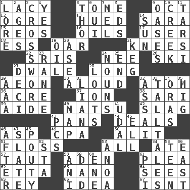 ACROSS 1. Made of lace 5. Heavy book 9. Sep. follower 12. Legendary monster 13. Took on color 14. "Two Mules for Sister ____" 15. Vintage cars 16. Petroleums 17. One who makes use of a thing 18. Curvy letter 19. Boat paddle 21. Leg joints 22. Indian titles of respect 24. Born 26. What Jean-Claude Killy likes to do 27. A sleeping potion; an opiate (poet.) 28. Protracted 29. Period of immesurable duration 30. Verbally 32. Smallest unit of an element 36. 1/640 square mile 37. Electrically charged atom 38. Indian skirt 39. Helper 40. Taiwanese island in East China Sea 42. Volcanic refuse 43. Zero-star reviews 44. Allots cards 46. Viper 49. Accounting whiz (abbr.) 50. Came down and settled, as after flight 51. Soft thread for cleaning between teeth 53. Everything 54. Had dinner 57. Tense 58. Arabian gulf 61. Entreaty 62. Singer James 63. Billionth: prefix 64. Observes 65. Marina Del _, California 66. The main thing one is thinking about 67. Is not DOWN 1. Old wives' tales, e.g. 2. Eras 3. What you're doing now 4. Affirmative reply 5. Son of Odin 6. Fr. "Yes" 7. Cartoonist voice _ Blanc 8. Begley and Asner 9. Fertile tracts in a desert 10. Small stream 11. Tarsus (plural) 14. Player for Phoenix 19. Lubricate 20. At sea 21. Cask 23. Indian princess (variant) 24. Parts of speech 25. Conclusion 27. Tenth: prefix 28. Plunders 29. Auto club (abbr.) 31. Woody, climbing, usually tropical plant 32. Slender Brazilian palm 33. Baron Munchausen's specialties 34. Mouths or openings 35. Russian fighter aircraft 40. Atlas unit 41. Freehold land 43. Personal Computers (abbr.) 45. Pipe bend 46. Following 47. Chalkboard 48. Inclined to pout 52. R.R. building 53. Small Philippine buffalo 55. Adolescent 56. 90 degrees 58. Black tropical American cuckoo 59. June honoree 60. Compass dir. 61. 23rd letter of the Greek alphabet