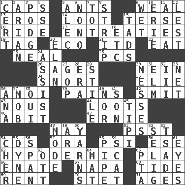 ACROSS 1. Smile enhancers 5. Pismires 9. Welt 13. Greek god of love 14. Plunder 15. Laconic 16. Travel on or in a vehicle 17. Pleas 19. Label 20. Environmental prefix 21. It would 22. Consume 23. Anneal 25. Personal Computers (abbr.) 26. Gurus 30. Chow _ 34. Derisive sound 35. Writer Wiesel 36. Mine, in Marseilles 39. Aches 42. Stricken, poetically 43. Horse sense 44. Plunders 46. "This won't hurt ____!" 47. Bert's buddy 48. Fifth month 51. Inconspicuous attention getter 54. Music discs 57. Mouth or opening 58. 23rd letter of the Greek alphabet 60. Compass dir. 62. Under the skin 65. Frolic 66. Maternal 67. California wine valley 68. Event that recurs at intervals 69. Monthly bill 70. Proofreading order 71. Matures DOWN 1. Sure thing 2. Believer in; advocate of (suffix) 3. Puddle 4. Compass dir. 5. Actor Baldwin 6. Words to Nanette 7. Small child 8. Remove all contents or possession from 9. Dripping 10. One of the Great Lakes 11. At sea 12. For fear that 15. Bits 18. And so on (abbr.) 20. Style 24. Help 27. Grand Old Party 28. Epoch 29. Vertical member of a panel or frame 30. Makes clutter 31. Shade tree 32. One more than two 33. Fish or hair follower 36. Santa ___, CA 37. Crowd into 38. Fr. "Yes" 40. Not either 41. Male child 45. Native american tent (variation) 48. Method 49. "We ___ not amused" (Victoria) 50. Tall tales 52. Major League Baseball Commissioner Bud 53. Sadhe (variant) 54. "Mermaids" star 55. Centimeter-gram-second unit of force 56. Connect, as a bridge 58. Corncob 59. Leave at once 61. Snake ____ (dice throw) 63. Baseball player Mel 64. Floor covering 65. Parent Teacher Association (abbr.)