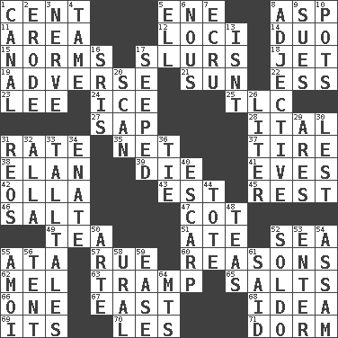 ACROSS 1. Penny 5. Compass dir. 8. Cleo's killer 11. Length times width 12. Venues 14. Superhero pair 15. Typical models 17. Plays smoothly or legato 18. _ stream 19. Contrary to your interests or welfare 21. Player for Phoenix 22. Curvy letter 23. Area sheltered from the wind 24. Frozen water 25. Affectionate concern, for short 27. Plant excrement 28. Slanted text style (abbr.) 31. Pace 35. Fish or hair follower 37. Hoop that covers a wheel 38. Style 39. Expire 41. Nights before holidays 42. Rounded earthenware pot or jar 43. Eastern Standard Time (abbr.) 45. Take ten 46. Table seasoning 47. Small bed 49. Beverage made from leaves 51. Had dinner 52. Ocean 55. _ moment's notice (2 wds.) 57. Regret 60. Thinks logically 62. Cartoonist voice _ Blanc 63. _____ steamer (cargo ship) 65. Table seasonings 66. Single 67. Compass direction 68. It may be bright or harebrained 69. ___ a Wonderful Life 70. French article 71. Dormintory (informal) DOWN 1. Lessep's creation 2. Wear away 3. Impudent aggressiveness 4. Not wild 5. Pipe bend 6. Common sense 7. Shade of tan 8. Descriptive word 9. Takes to court 10. Cooking vessels 13. Is not 16. Indian titles of respect 17. Oozed 20. Glance over 26. 61 cubic inches 29. Ancient Greek god of war 30. For fear that 31. Vintage cars 32. Silent film actress Nazimova 33. Baron Munchausen's specialties 34. Related on the mother's side 36. Neckwear 40. Fortification 44. Lug 48. Afternoon social gatherings 50. Johnson of "Laugh-In" 52. Twentieth part of a lira 53. Keyboard key 54. Indian state 55. Mine, in Marseilles 56. Portable shelter 58. Mountain range 59. Comfort 61. Expressed in words 64. Mountains (abbr.)