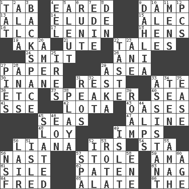 ACROSS 1. Bar bill 4. Having ears or earlike features 9. Moist 13. In the manner of 14. Dodge 15. Actor Baldwin 16. Affectionate concern, for short 17. Soviet premier 1918-24 18. Coop moms 19. Alias (abbr.) 21. Shoshoni 22. Falsehoods 24. Stricken, poetically 26. Cuckoo 27. Some stationery 29. At sea 30. Silly 31. State of inaction 33. Had dinner 36. And so on (abbr.) 37. Orator 40. Ocean 41. Compass dir. 42. Globular water bottle used in Asia 43. Fertile tracts in a desert 45. Oceans 47. Place in a line 48. Myrna of the movies 49. Naughty children 50. Climbing, woody, usually tropical vines 52. Big collection agency 54. R.R. building 56. Political cartoonist Thomas 57. Took without asking 59. Nanny (var.) 61. Filth; sediment 62. Eucharist need 63. Tired old horse 64. Flintstone 65. Having winglike extensions 66. Definite Article DOWN 1. Make lace 2. Silent film actress Nazimova 3. Keyboard key 4. Snakelike fish 5. Native American of Southwest Alaska 6. Undersized animal 7. Singer Brickell 8. Lair 9. Mexican or Central American flower 10. Toward shelter 11. Not women's 12. Personal Computers (abbr.) 20. So be it 22. Clothes sense 23. One (Scot) 25. Angers 27. Sliced desserts 28. Pismires 29. "____ silly question..." 31. Vintage cars 32. Ingest 33. Aide 34. Adolescent 35. Relaxation 38. Beach, in Buenos Aires 39. Wander aimlessly 44. High mountains 45. Scheduled 46. Period of immesurable duration 49. Small island 50. Den 51. Capri or Wight 52. Slanted text style (abbr.) 53. Round or rotation of duties 55. Nursemaid 56. Science/research agcy. 57. Health resort 58. Compass dir. 60. Personal question