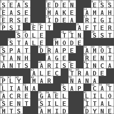 ACROSS 1. Oceans 5. Genesis locale 9. Double-curved letter 12. Comfort 13. Create 14. Housemaid 15. Celtic language 16. It may be bright or harebrained 17. Swiss mountan, "Queen of the Mountains" 18. 23rd letter of the Greek alphabet 19. Lizard (obsolete) 21. Following 22. Flatfish 24. Shallow baking pan 26. Fast jet (abbr.) 27. Showing deterioration from age 28. Method 29. Petty quarrel 30. Window treatment 32. Mine, in Marseilles 36. Hyperbolic tangent 37. Personal question 38. Monthly bill 39. Pismires 40. Originate 42. South American Indian 43. Actor Baldwin 44. Buy and sell 46. Apply oneself diligently 49. Impair 50. Grandmother 51. Climbing, woody, usually tropical vines 53. Plant excrement 54. Domesticated feline 57. 1/640 square mile 58. Highlander 61. _ and Stitch 62. Posted 63. Filth; sediment 64. Slanted text style (abbr.) 65. Mountains (abbr.) 66. Among 67. Centimeter-gram-second unit of force DOWN 1. Ooze 2. Hearing organs 3. Aide 4. Perceive with the eye 5. Send forth 6. Male parent 7. Supplement with great effort 8. Teachers' org. 9. Sends forth 10. Gurus 11. Chest covering 14. Sandy's bark 19. Pipe bend 20. Nourish 21. A saturated hydrocarbon 23. Expletives 24. Drinks excessively 25. Binary compound 27. Connect, as a bridge 28. Mysterious quality of enchantment 29. R.R. building 31. Less widely known 32. Believer in; advocate of (suffix) 33. Ananias' fault 34. Single time 35. Call ___ day 40. Wing 41. Inactive volcano in Sicily 43. Nanny (var.) 45. Hit sharply and swiftly 46. Suffix with ecto or cyto 47. It is permitted: Lat. 48. Entertaining tales 52. Fish or hair follower 53. Downhill vehicle 55. ____ Jay Lerner 56. Lacquered or enameled metalware 58. Girls' org. (abbr.) 59. Direct toward a target or goal 60. Connecticut Ivy Leaguer 61. Hat (slang)