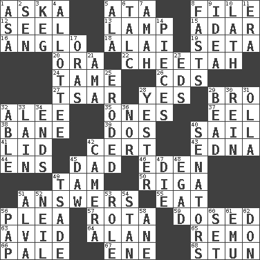 ACROSS 1. "____ silly question..." 5. "One Day ___ Time" 8. Do some clerical work 12. Sew up the eyelids of hawks and falcons 13. Desk light 15. The sixth month of the Jewish calendar 16. White American of non-Hispanic descent 18. Jai _ 19. Stalk of a moss capsule 20. Mouth or opening 22. Leopard's kin 24. Not wild 26. Music discs 27. Russian ruler of old 28. It is so 29. Sis' sibling 32. Toward shelter 35. Washington bills 37. Snakelike fish 38. Object of repulsion 39. Two (Sp.) 40. Move on water 41. Flaplike covering 42. Foregone conclusion 43. Pulitzer Prize-winning author Ferber 44. Followers of ems 45. June honoree 46. Locale of original sin 49. Scottish cap 50. Capital of Latvia 51. Statements in reply to questions 55. Ingest 56. Entreaty 57. Round or rotation of duties 59. Administered medicine 63. Enthusiastic 64. ____ Jay Lerner 65. San ____ (Riviera town) 66. Light colored 67. Compass dir. 68. Make senseless or dizzy DOWN 1. White ___ sheet 2. Elected rep. 3. Cask 4. One to whom something is allotted 5. According to 6. Baby powder 7. Housemaid 8. Goes without food and/or water 9. It may be bright or harebrained 10. Thin strip of wood or metal 11. Period 14. Parts 17. Mouths or openings 21. Housemaid (var.) 23. Begley and Asner 25. Eaten away 28. Of or pertaining to yesterday 29. Necklace unit 30. It's straight from the horse's mouth 31. Spanish pot 32. Competent 33. (Had) reclined 34. Conclusions 36. Not either 40. Legislators 42. Device for capturing images 45. Fool 47. Pass on 48. Mild oath 49. Sadhe (variant) 51. Inventor's middle name 52. Famous astronaut Armstrong 53. Hero or heavy, e.g. 54. Comedian Laurel of Laurel & Hardy 56. Infant food 58. One (Scot) 60. Put into a specified state 61. Australian flightless bird 62. Spanish title