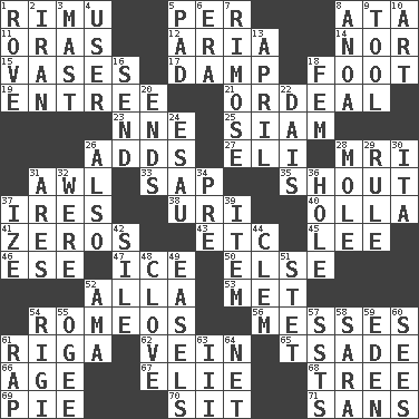 ACROSS 1. Tall New Zealand timber tree 5. For each 8. "One Day ___ Time" 11. Mouths or openings 12. Operatic vocal solo 14. And not 15. Flower holders 17. Moist 18. 12 inches 19. Main course 21. Severe or trying experience 23. Compass dir. 25. Thailand, formerly 26. Sums up 27. Connecticut Ivy Leaguer 28. Medical imaging device (abbr.) 31. Leather borer 33. Plant excrement 35. Yell 37. Angers 38. RI univ. 40. Spanish pot 41. Nothings 43. And so on (abbr.) 45. Area sheltered from the wind 46. Compass dir. 47. Frozen water 50. Otherwise 52. Silent film actress Nazimova 53. Was introduced to 54. Lover boys 56. Makes clutter 61. Port city in Latvia 62. Distinctive style or manner 65. Sadhe (variant) 66. Ripen 67. Writer Wiesel 68. Woody plant 69. Sliced dessert 70. Be seated 71. Without DOWN 1. Be footloose 2. SW Asia republic 3. Vertical spar for supporting sails 4. One who uses or employs something 5. Groovy apt. 6. Period 7. Full of chinks, cracks, or crevices 8. Small Philippine buffalo 9. Implement 10. Tate display 13. Showery time 16. Post 18. Opposite of masc. 20. Extremities 22. Raised platform 24. He sold his birthright 26. In addition 28. Undercover agent 29. Court order 30. Call ___ day 31. Ancient Greek god of war 32. We are 34. Before (prefix) 36. Opening into or through something 37. Ending with capital 39. Detail 42. Drop; flow; fall 44. Clement's nick name 48. Garlic unit 49. Artist's stands 51. Proofreading order 52. Nursemaid (var.) 54. Swiss mountan, "Queen of the Mountains" 55. Double curve, resembling the letter S 57. Fast planes 58. "Two Mules for Sister ____" 59. Genesis locale 60. Perceives with the eye 61. Reproach for some lapse or misdeed 63. One more than two 64. Remaining after all deductions