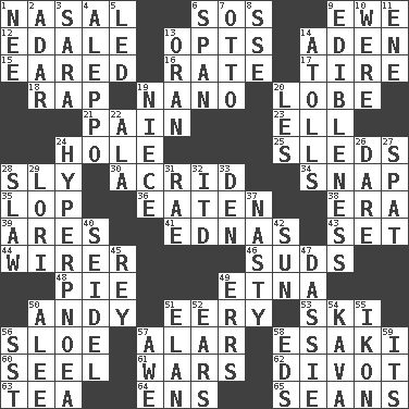 ACROSS 1. Rhinal 6. Mayday 9. She-sheep 12. Peak District village in England 13. Chooses 14. Arabian gulf 15. Having ears or earlike features 16. Pace 17. Become fatigued 18. Hit sharply and swiftly 19. Billionth: prefix 20. Ear part 21. Ache 23. Pipe bend 24. Hollow 25. Bobsleighs 28. Roguish 30. Bitter 34. Fastener 35. Chop off 36. Consumed 38. Epoch 39. Ancient Greek god of war 41. Ferber et al. 43. Put into a specified state 44. One who wires 46. Beer foam 48. Sliced dessert 49. Inactive volcano in Sicily 50. Actor Griffith 51. Suggestive of the supernatural 53. What Jean-Claude Killy likes to do 56. A type of plum 57. Having or resembling wings 58. 1973 Nobel Price Winner (Physics) Leo 60. Stitch closed the eyes of (a falcon) 61. Armed conflicts 62. A piece of turf (Scot.) 63. Afternoon social gathering 64. Followers of ems 65. Seines DOWN 1. Born 2. The sixth month of the Jewish calendar 3. "Two Mules for Sister ____" 4. City in Syria 5. Directed 6. Connect, as a bridge 7. Von Bismarck 8. Compass dir. 9. The property of being fit to eat 10. We are 11. Compass dir. 13. NW Algerian seaport 14. Ringlike coral islands and reefs 19. Sibling's daughter 20. French article 22. Chicken ___ king 24. Abnormally rapid or deep breathing 26. Have the gumption 27. Argument over a trivial matter 28. Cole _ (cabbage dish) 29. Australian parrot (variant) 31. Actress Charlotte 32. It would 33. Lair 37. Characterized by obscenity 40. Beer mug 42. Player for Phoenix 45. Marina Del _, California 47. Small ungulate mammals of Africa 49. Blunders 50. Toward shelter 51. Enthusiasm 52. Hearing organs 54. Polynesian shrub of the pepper family 55. Visual representation of an object 56. Fast jet (abbr.) 57. Deep reverence 58. Begley and Asner 59. It is
