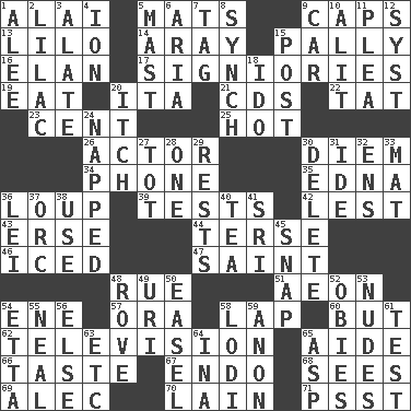 ACROSS 1. Mountain range southwest of Kyrgyzstan 5. Floor protectors 9. Smile enhancers 13. _ and Stitch 14. Like ___ of sunshine 15. Chummy 16. Flair 17. Seigniories (variant) 19. Erode 20. Call ___ day 21. Music discs 22. Make lace 23. Penny 25. Being at a high temperature 26. Thespian 30. South Vietnam president (1954) 34. Give a jingle 35. Pulitzer Prize-winning author Ferber 36. Central Nebraska county 39. Trials 42. For fear that 43. Celtic language 44. Laconic 46. On the rocks 47. Virtuous person 48. Sorrow 51. A really long time 54. Compass dir. 57. Mouth or opening 58. Infant locale 60. With the exception that 62. Household entertainment appliance 65. Assistant 66. Clothes sense 67. Inside; within (prefix) 68. Perceives with the eye 69. Actor Baldwin 70. (Had) reclined 71. Inconspicuous attention getter DOWN 1. Toward shelter 2. Pale purple color 3. Having winglike extensions 4. Electrically charged atom 5. Vertical spar for supporting sails 6. Roberta Peters solo 7. Label 8. Synchronize (abbr.) 9. 4-wheeled motor vehicle 10. Came down and settled, as after flight 11. Entreaty 12. System (abbr.) 15. Mail 18. Wedding promise 20. Hankering 24. Slept 27. Small child 28. Single 29. Musical pauses 30. Keyboard key 31. Binary compound 32. Followers of ems 33. Floor protector 36. Luau accessory 37. The grampus (Milton) 38. Purpose 40. Beverage made from leaves 41. _ Lanka 45. Fastener 48. Be footloose 49. RI univ. 50. Artist's stand 52. Off-Broadway awards 53. Unadorned figures 54. Singer James 55. Actress Patricia 56. Otherwise 58. Farming town in central California 59. Soon (poet.) 61. Trial 63. And so on (abbr.) 64. _ tizzy (2 wds.) 65. Viper