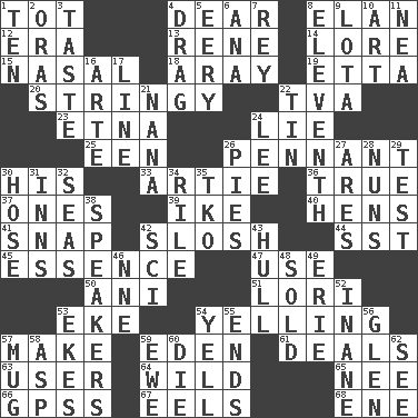 ACROSS 1. Small child 4. Letter starter 8. Style 12. Epoch 13. French philosopher Descartes 14. Old wives' tales, e.g. 15. Rhinal 18. Like ___ of sunshine 19. Singer James 20. Slender, wiry 22. Federal power corp. 23. Inactive volcano in Sicily 24. Untruth 25. Car or cant ending 26. Pre-World Series prize 30. Part of HMS, perhaps 33. Nick name for Arthur 36. Loyal 37. Washington bills 39. Mamie's mate 40. Coop moms 41. Fastener 42. Splash clumsily 44. Fast jet (abbr.) 45. Core 47. Purpose 50. Black tropical American cuckoo 51. Australian parrot (variant) 53. Supplement with great effort 54. Crying or shouting loudly 57. Create 59. Genesis locale 61. Allots cards 63. One who makes use of a thing 64. Rampant 65. Born 66. Global Positioning Systems (abbr.) 67. Snakelike fish 68. Compass dir. DOWN 1. Nine, plus one 2. Mouths or openings 3. Clothes sense 4. To draw with force 5. Suggestive of the supernatural 6. Santa ___, CA 7. Marina Del _, California 8. Veterans Day date 9. Globular water bottle used in Asia 10. Tate display 11. Teachers' org. 16. Johnson of "Laugh-In" 17. Actor's bit 21. Grandmother 22. Shallow baking pan 24. Area sheltered from the wind 26. Sliced desserts 27. Ancient Greek god of war 28. Religious women 29. Trial 30. Flexible conduit 31. Taverns 32. Oceans 34. Cause heat under the collar 35. Ring climax 38. Orators 42. _-fi 43. Frame or body of a ship 46. Compass dir. 48. Disposed of to a purchaser 49. 4th largest of the Great Lakes 52. Silly 53. Supplements with great effort 54. Shout 55. Extremities 56. Small, secluded valley 57. Large cup 58. Viper 59. She-sheep 60. Expire 62. Perceive with the eye