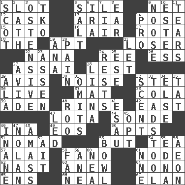 ACROSS 1. Narrow opening 5. Drop; flow; fall 9. Fish or hair follower 12. Keg 13. Roberta Peters solo 14. Airs 15. Von Bismarck 16. Den 17. Roll call or roster of names 18. Definite Article 19. Fitting 21. Failure 22. Grandmother 24. To separate or throw off 26. Double-curved letter 27. Slender Brazilian palm 28. For fear that 29. Advice 30. Annoying sound 32. Proofreading order 36. Not recorded 37. Floor covering 38. Root beer relative 39. Arabian gulf 40. Remove soap 42. Compass direction 43. Globular water bottle used in Asia 44. Message 46. _ tizzy (2 wds.) 49. Greek goddess of the dawn 50. Tenement units (abbr.) 51. Wanderer 53. On the contrary 54. Beverage made from leaves 57. Jai ____ 58. Papal veil 61. Thickened enlargement 62. Political cartoonist Thomas 63. Afresh 64. Words to Nanette 65. Followers of ems 66. Anneal 67. Liveliness DOWN 1. Highlander 2. Thin strip of wood or metal 3. Clearly or manifestly demonstrative 4. Ring climax 5. Table seasoning 6. Lyricist Gershwin 7. Cards in a Roman deck? 8. Hearing organ 9. Trap for birds or small mammals 10. _____ Park, CO 11. Rends 14. Adept person 19. Santa ___, CA 20. Ache 21. Allow 23. NE Netherlands city 24. Musical pauses 25. Compass dir. 27. Enthusiastic 28. Climbing, woody, usually tropical vines 29. Wing 31. Leaves out 32. Odor 33. Inedible or poisonous agaric 34. Otherwise 35. Make lace 40. Friend of Pooh 41. He sold his birthright 43. Directed 45. Choose 46. Lacking in sense or substance 47. Pitcher Ryan 48. Collect or gather 52. Small island 53. Soup holder 55. Pulitzer Prize-winning author Ferber 56. Period of immesurable duration 58. Avid follower 59. A saturated hydrocarbon 60. Teachers' org. 61. Compass dir.