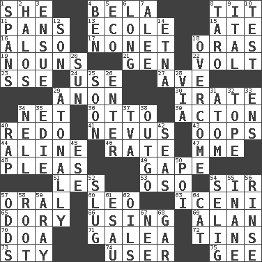 ACROSS 1. A female animal or person 4. Actor Lugosi 8. Teat (slang) 11. Baking dishes 13. Learning spot: Fr. 15. Had dinner 16. In addition 17. Music written for nine 18. Mouths or openings 19. Parts of speech 21. Commissioned mil. rank 22. Electrical Unit 23. Compass dir. 24. Purpose 27. "___ Maria" 29. Soon (poet.) 30. Feeling or showing extreme anger 34. Fish or hair follower 36. "Beetle Bailey" pooch 39. NE Massachussets city 40. Do over again 41. Mole, birthmark 43. I made a mistake 44. Place in a line 46. Assign a rank or rating to 47. Madame (abbr.) 48. Entreaties 49. Stare wonderingly 51. French article 53. Bear (Spanish) 54. Title for a knight 57. Relating to the mouth 60. Lion 63. Ancient Celtic tribe of eastern Britain 65. Rowboat 66. Exploiting 69. ____ Jay Lerner 70. ___ good deed 71. An organ shaped like a helmet 72. Canisters 73. Filthy place 74. One who uses or employs something 75. Unit of force equal to gravity DOWN 1. Connects, as a bridge 2. Saint headwear 3. Follow as a consequence or result 4. Benjamin's nick name 5. Environmental prefix 6. Yearn 7. Toward shelter 8. Pacific island yam 9. Slanted text style (abbr.) 10. Trial 12. Male child 14. Inactive volcano in Sicily 18. Conquer 20. Player for Phoenix 25. Within a short period 26. Keyboard key 28. By way of 29. Without tonality 31. Tiny particle 32. Drink excessively 33. Followers of ems 34. 1994 drama film starring Jodie Foster 35. Singer Brickell 37. Federal power corp. 38. Money paid out 40. Reproach for some lapse or misdeed 42. Oceans 45. Compass dir. 50. Luau course 52. Strike heavily 54. Major League Baseball Commissioner Bud 55. Lacking in sense or substance 56. Wash lightly 57. Likelihood 58. Carrot, for example 59. Like ___ of sunshine 61. Son of Isaac 62. Lubricates 64. Domesticated feline 67. Born 68. Slender fish