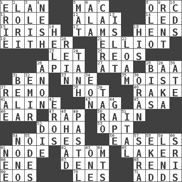 ACROSS 1. Liveliness 5. Apple computer (short form) 8. The grampus (Milton) 11. Hero or heavy, e.g. 12. Mountain range southwest of Kyrgyzstan 14. Directed 15. From or relating to Ireland 17. Scottish caps 18. Coop moms 19. One or the other 21. American author Paul (1891-1958) 23. Allow 25. Vintage cars 26. Capital of Western Samoa 27. "One Day ___ Time" 28. Sound made by sheep 31. Benjamin's nick name 33. Compass dir. 35. Wet 37. San ____ (Riviera town) 38. Being at a high temperature 40. Immoral or dissolute person 41. Place in a line 43. Tired old horse 45. White ___ sheet 46. Hearing organ 47. Hit sharply and swiftly 50. Precipitation 52. Capital of the state of Qatar 53. Choose 54. Annoying sounds 56. Artist's stands 61. Thickened enlargement 62. Tiny particle 65. Member of a famous L.A. basketball team 66. Compass dir. 67. Undesirable depression on a surface 68. Painter Guido (1575-1642) 69. Greek goddess of the dawn 70. French article 71. Sums up DOWN 1. 4th largest of the Great Lakes 2. Australian parrot (variant) 3. Set down 4. Delicate 5. Floor covering 6. Wing 7. Device for capturing images 8. Margarine 9. Monthly bill 10. Music discs 13. Small island 16. Assist 18. Part of HMS, perhaps 20. It's straight from the horse's mouth 22. Rich soil 24. Hyperbolic tangent 26. Soon (poet.) 28. Prejudice 29. "____ silly question..." 30. Had dinner 31. Actor Lugosi 32. Arab leader 34. A really long time 36. Northwest Algerian city 37. Actress Charlotte 39. Edible starchy tuberous root 42. Greek god of love 44. Open wide 48. At or in the front 49. Soft color 51. Slanted text style (abbr.) 52. Pass on 54. Words to Nanette 55. Lyric poems 57. "Two Mules for Sister ____" 58. Supplemented with great effort 59. Grant temporary use of 60. Indian titles of respect 61. Born 63. Single 64. Mountains (abbr.)
