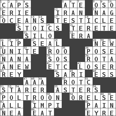 ACROSS 1. Smile enhancers 5. Had dinner 8. Bear (Spanish) 11. 4th largest of the Great Lakes 12. SW Asia republic 13. Tired old horse 14. Seas 17. A testis 19. Unemotional ones 21. Cylindrical with tapered ends 22. Grain storage tower 23. Epoch 24. Mouth edge 27. Lick closed 29. ___ Haven, CT 32. Join together 34. Friend of Pooh 36. Introduce or present, as a question 37. Grandmother 38. Distress signal 39. Roll call or roster of names 40. Afresh 41. And so on (abbr.) 42. Failure 43. Marina Del _, California 44. Indian skirt 46. Curvy letter 47. American Automobile Association (abbr.) 50. College mil. group 52. A viewer who gazes fixedly 55. Michaelmas daisies 57. Characterized by complete cowardliness 59. Threatening words 62. 100% 63. Body of Kaffir warriors 64. Ache 65. Teachers' org. 66. Consume 67. Jane of fiction DOWN 1. Corporate head (abbr.) 2. Curve 3. Sliced desserts 4. Theater features 5. "We ___ not amused" (Victoria) 6. Clothes sense 7. Keyboard key 8. At one time in the past 9. Table seasoning 10. Double curve, resembling the letter S 12. It is 15. Annoying sound 16. Filth; sediment 18. Lyricist Gershwin 20. Unrefined 24. Type of eclipse 25. Lacking in sense or substance 26. Abounding in pines 28. Plunders 29. Trap for birds or small mammals 30. _____ Park, CO 31. Puts on (as clothing) 33. The 23rd letter of the Hebrew alphabet 35. Motion picture awards 36. Adept person 42. 61 cubic inches 45. Printing process, for short 47. Tate display 48. Nest on high 49. Odor 51. Streamer paper 52. Connect, as a bridge 53. Lacquered or enameled metalware 54. Silent film actress Nazimova 55. Cuckoo 56. Kill 58. Elect 60. Title for a knight 61. Compass dir.