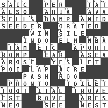 ACROSS 1. Ketch in the Levant 5. For each 8. Make lace 11. In addition 12. Roberta Peters solo 14. Actress Gardner 15. Makes a sale 17. Moist 18. Among 19. Sowing specialist 21. Declaimed 23. Victory 25. Filth; sediment 26. Southeast Asian peninsula 27. Shade tree 28. Basketball assoc. 31. Scottish cap 33. And so on (abbr.) 35. To the left, to Queeg 37. Frolic 38. Hearing organ 40. Toward the sea 41. Came up 43. Consenting reply 45. Allow 46. Luau course 47. Pet locale 50. Measure of real estate 52. Romantic infatuation 53. Friend of Pooh 54. Right away 56. Bathroom 61. A blast of a horn 62. Slanted text style (abbr.) 65. Collection of objects 66. Eastern Standard Time (abbr.) 67. Be footloose 68. Ancient Greek god of war 69. Modern: prefix 70. Observe 71. A home for chicks DOWN 1. Backtalk 2. Toward shelter 3. Small island 4. Lacking warmth 5. Writing tablet 6. Period 7. Full of chinks, cracks, or crevices 8. Not wild 9. Enthusiastic 10. Small amount or degree 13. Showery time 16. Stitched 18. Had dinner 20. Travel on an animal 22. _ mater 24. Musical sound 26. Naughty children 28. Sense of smell 29. Cy Young winner Saberhagen 30. _ moment's notice (2 wds.) 31. "Corrida" creature 32. Mine, in Marseilles 34. Island 36. Diluted with white 37. Strike 39. Tail end 42. Liveliness 44. Highlander 48. Moving or stirring 49. Pictures 51. Carrot, for example 52. Plant holder 54. Airs 55. Printing process, for short 57. SW Asia republic 58. Old wives' tales, e.g. 59. Nights before holidays 60. Trial 61. "___ Little Indians" 63. "___ Maria" 64. Area sheltered from the wind