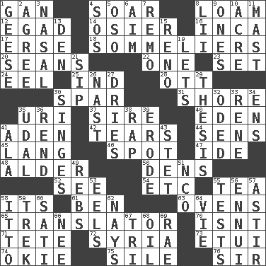 ACROSS 1. Separate the seeds from cotton 4. Fly high 8. Rich soil 12. Mild oath 14. Flexible twig of a willow tree 16. South American Indian 17. Celtic language 18. Wine waiters 20. Seines 22. Single 23. Arrange properly for use 24. Snakelike fish 25. Working for oneself (abbr.) 28. Baseball player Mel 30. Coast Guard woman 31. Dinah or Pauly 35. RI univ. 37. The founder of a family 40. Paradise 41. An important port of Yemen 42. Rends 44. Elected reps. 45. Long (Scottish) 46. Specific locale 47. Binary compound 48. Tree or shrub in the Birch family 50. Cub Scout units 52. Perceive with the eye 54. And so on (abbr.) 55. Afternoon social gathering 58. It is 61. Benjamin's nick name 63. Baking chambers 65. Interpreter 70. Is not 71. False hair 72. Damascus' land 73. Needle case 74. Migrant worker of the '30s 75. Filth; sediment 76. Title for a knight DOWN 1. Honkers 2. Match 3. Relating to the nose 4. Mayday 5. Bear (Spanish) 6. Direct toward a target or goal 7. San ____ (Riviera town) 8. Cards in a Roman deck? 9. Washington bills 10. Measure of real estate 11. Vertical spar for supporting sails 13. Lair 15. Western Nevada city 19. Allows 21. Small drink 26. Political cartoonist Thomas 27. Frees from moisture 29. College paper 30. Burns superficially 32. Wrote a lyric poem 33. French philosopher Descartes 34. Followers of ems 35. Hereditary estate 36. Tear apart 38. Strike 39. Eat (away) 41. Wing 43. Proofreading order 49. Confederate soldiers (slang) 51. Non-commissioned officer (abbr.) 53. Snakelike fish 55. Trials 56. World-weariness 57. Being in motion 58. "Tell ____ the Marines!" 59. Long journey 60. Suttee (variant) 62. Negative votes 64. Compete 66. Born 67. Three (prefix) 68. Petroleum 69. Actress Charlotte