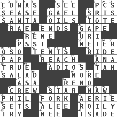 ACROSS 1. Ferber et al. 6. Perceive with the eye 9. Personal Computers (abbr.) 12. Gospel singer Marvin 13. Highlander 14. Indian titles of respect 15. Before Barbara or Clara 16. Lubricates 17. Haul 18. Actress Charlotte 19. Extremities 20. Yawn 21. French philosopher Descartes 23. RI univ. 24. Inconspicuous attention getter 25. Distance measurement 28. Bear (Spanish) 30. Portable shelters 34. Travel on or in a vehicle 35. Infant food 36. Arrive at 38. Santa ___, CA 39. Loyal 41. Goodbye (Sp.) 43. Scottish cap 44. Vegetable dish 46. Greater amount 48. White ___ sheet 49. Former U.S. Attorney General Janet 50. Group working together 51. Play the lead 53. Informal term for the mouth 56. Silvers or Donahue 57. Tined utensil 58. Nest on high 60. Arranges properly for use 61. Toward shelter 62. Turbulent 63. Attempt to accomplish something 64. Born 65. Sadhe (variant) DOWN 1. Double-curved letter 2. Letter starter 3. Nanny 4. Michaelmas daisies 5. Ocean 6. Expressed in words 7. Snakelike fish 8. Raised railways 9. Conciliate 10. Quote 11. Compass dir. 13. Went 14. A viewer who gazes fixedly 19. Keyboard key 20. Chewing product 22. Eastern Standard Time (abbr.) 24. Teen's desire 26. Pulitzer Prize-winning author Ferber 27. 480, 500 or 516 sheets of paper 28. Chooses 29. "Two Mules for Sister ____" 31. Teachers' org. 32. Small boy 33. _-fi 37. Home run 40. Artist's stands 42. Male offspring 45. Fool 47. Lover boys 49. Libertine 50. "Mermaids" star 51. Not divided or shared with others 52. Relationship diagram 54. Roberta Peters solo 55. Uncontrolled 56. Pacific Standard Time (abbr.) 57. Air blower 58. Tate display 59. Sight organ