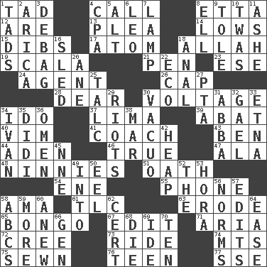 ACROSS 1. Bit 4. Give a ring to 8. Singer James 12. "We ___ not amused" (Victoria) 13. Entreaty 14. Moos 15. Rights 17. Tiny particle 18. Assad's deity 19. Any of the three canals of the cochlea 21. Fenced enclosure 23. Compass dir. 24. Rep 26. Head covering 28. Letter starter 30. Electrical Measurement 34. Wedding promise 37. Pale green bean 39. Blind as ____ 40. Zeal 41. Team commander 43. Benjamin's nick name 44. An important port of Yemen 46. Loyal 47. In the manner of 48. Fools 51. Pledge 54. Compass dir. 55. Give a jingle 58. Nanny (var.) 61. Affectionate concern, for short 63. Wear away 65. Beat drum 67. Prepare for publication 71. Roberta Peters solo 72. Algonquian 73. Travel on an animal 74. Mountains (abbr.) 75. Stitched 76. Adolescent 77. Compass dir. DOWN 1. Small amounts or degrees 2. N. Chile seaport 3. Debunk (Brit. slang) 4. Numbers guy (abbr.) 5. Keyboard modifier key 6. Lion 7. Desk light 8. Pipe bend 9. Lacquered or enameled metalware 10. It was, poetically 11. American tennis player Robert 16. Downhill vehicle 18. Of or related to the anus 20. One (Scot) 22. Environmental prefix 25. Baby powder 27. Parent Teacher Assoc. 29. Disturbances 30. In a vacuum (with "in") 31. Swedish rock group 32. Highlander 33. Inactive volcano in Sicily 34. _ the terrible 35. "You Light Up My Life" star Conn 36. Presage 38. Make imperfect 42. Pile 45. Compass dir. 49. To the inside or interior of 50. Snakelike fish 52. Definite Article 53. Israeli folk dance 56. Typical models 57. Prepares for publication 58. Lettered men learn these first 59. Greater amount 60. Afresh 62. Foregone conclusion 64. Relaxation 66. Commissioned military rank (abbr.) 68. Pass on 69. Binary compound 70. "___ Little Indians"