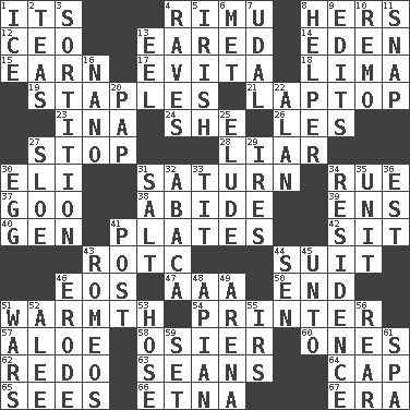 ACROSS 1. It is 4. Tall New Zealand timber tree 8. Possessive pronoun 12. Corporate head (abbr.) 13. Having ears or earlike features 14. Locale of original sin 15. Merit 17. Webber/Rice musical 18. Pale green bean 19. Paper fasteners 21. Portable computer 23. _ tizzy (2 wds.) 24. A female animal or person 26. French article 27. Constrict 28. One who doesn't tell the truth 30. Biblical high priest 31. Titan orbits this 34. Sorrow 37. Thick or sticky substance 38. Stay 39. Followers of ems 40. Commissioned mil. rank 41. Food holders 42. Be seated 43. College mil. group 44. Set or collection 46. Greek goddess of the dawn 47. Auto club (abbr.) 50. Conclusion 51. Heat 54. Hard copy producer 57. _ vera 58. Flexible twig of a willow tree 60. Singles 62. Redecorate 63. Actors Connery and Penn 64. Head covering 65. Perceives with the eye 66. Inactive volcano in Sicily 67. Period DOWN 1. Frozen water 2. Beverages made from leaves 3. Determination 4. All-night dance parties 5. From or relating to Ireland 6. Was introduced to 7. Hereditary estate 8. Assistant 9. Proofreads 10. San ____ (Riviera town) 11. Fastener 13. Snakelike fish 16. Billionth: prefix 20. Infant food 22. Actor Alda or Thicke 25. Dodge 27. _ gin 29. Angers 30. Ovum 31. Table seasoning 32. Phillipine bananalike plant 33. Teat (slang) 34. Home 35. A single undivided whole 36. Eastern Standard Time (abbr.) 41. Mail 43. Lover boys 44. Elected rep. 45. To (old English) 46. Wear away 48. Bee-related 49. Sports stadium 51. Armed conflicts 52. Toward shelter 53. Flexible conduit 55. Big collection agency 56. Stern 59. Put into a specified state 61. Health resort