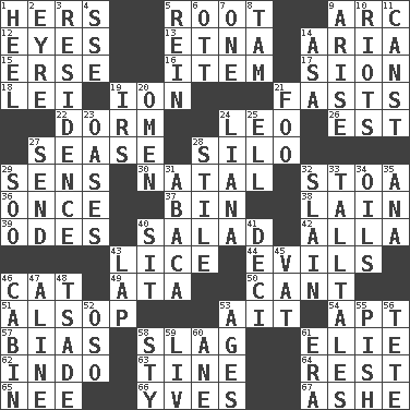 ACROSS 1. Possessive pronoun 5. Carrot, for example 9. Curve 12. Snake ____ (dice throw) 13. Inactive volcano in Sicily 14. Roberta Peters solo 15. Celtic language 16. A whole individual unit 17. The Jewish people; Israel 18. Luau accessory 19. Electrically charged atom 21. Goes without food and/or water 22. Dormintory (informal) 24. Lion 26. Eastern Standard Time (abbr.) 27. Gospel singer Marvin 28. Grain storage tower 29. Elected reps. 30. Brizilian seaport 32. Portico 36. At one time in the past 37. Storage container 38. (Had) reclined 39. Lyric poems 40. Vegetable dish 42. Silent film actress Nazimova 43. Louse (plural) 44. Vices 46. Domesticated feline 49. "One Day ___ Time" 50. Patter 51. Columnist Joseph or Stewart 53. Small island 54. Fitting 57. Prejudice 58. Volcanic refuse 61. Writer Wiesel 62. _ china 63. Prong on a fork 64. Respite 65. Born 66. Jacques Cousteau's middle name 67. American tennis player Robert DOWN 1. Person who is morally reprehensible 2. Jane of fiction 3. Home 4. Compass dir. 5. It's straight from the horse's mouth 6. Baseball player Mel 7. Single 8. Scottish cap 9. Originate 10. Debaucheries 11. 2nd pers. sing. pres. of can (arch.) 14. White ___ sheet 19. Big collection agency 20. Sign of something about to happen 21. Egg _ yung 23. Fertile tracts in a desert 24. Climbing, woody, usually tropical vines 25. Pipe bend 27. Post 28. Vertical member of a panel or frame 29. "Barney Miller" actor Jack 31. Phillipine bananalike plant 32. Killed 33. Baron Munchausen's specialties 34. Lubricates 35. Santa ___, CA 40. Be seated 41. Tenth: prefix 43. Pet locale 45. Large container 46. Apartment or room in a ship 47. Place in a line 48. Sadhe (variant) 52. Bear (Spanish) 53. Eons 55. Expression of disdain 56. Wig 58. Filthy place 59. 54 in ancient Rome 60. A saturated hydrocarbon 61. Epoch
