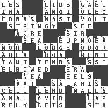 ACROSS 1. French article 4. Hats (slang) 8. Highlander 12. _ tizzy (2 wds.) 13. Mine, in Marseilles 14. Butter sub 15. Ferber et al. 18. Political cartoonist Thomas 19. Electrical Unit 20. Slender, wiry 22. Perceive with the eye 23. 1/640 square mile 24. Title for a knight 25. Ocean 26. Normal relaxed breathing 30. Not either 33. Cabin 36. Scent 37. Length times width 39. ___ good deed 40. Monthly bill 41. Drawn tight 42. Is inclined (to) 44. Compass dir. 45. Turned at an angle; bent 47. Epoch 50. Teachers' org. 51. Snakelike fish 53. Large container 54. Deli grouping 57. To provide with a ceiling 59. Grant temporary use of 61. Shopping centers 63. Of or related to the anus 64. Enthusiastic 65. Infant locale 66. Have trust in 67. Wagers 68. R.R. building DOWN 1. Falsehood 2. Conclusions 3. Before Barbara or Clara 4. Long (Scottish) 5. "If ____ say so..." 6. Two (Sp.) 7. Be seated 8. Head of state? 9. _ vera 10. Snakelike fish 11. Car dealer's back yard 16. Curves 17. Father 21. Actress Patricia 22. Small drink 24. Take to court 26. Mild oath 27. Lyric poems 28. Immeasurably long periods of time 29. Johnson of "Laugh-In" 30. Nathan's nickname 31. Relating to the mouth 32. Reuben's nickname 34. Wrote a lyric poem 35. Spanish title 38. Without tonality 42. Afternoon social gathering 43. Stitch closed the eyes of (a falcon) 46. Dripping 48. 480, 500 or 516 sheets of paper 49. _ mater 52. Beverly of Met fame 53. Small bottle 54. In a ____ (agitated or irritated) 55. Does sums 56. Narrow board 57. 4-wheeled motor vehicle 58. Compass dir. 59. Experiment locale 60. First lady 62. Health resort