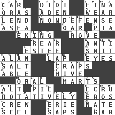 ACROSS 1. Auto 4. "You Light Up My Life" star Conn 8. Inactive volcano in Sicily 12. Mouths or openings 14. An important port of Yemen 15. Erode 16. Grant temporary use of 17. Unrelated to defense, as in spending 20. Toward the sea 21. Rowing implement 22. Parent Teacher Association (abbr.) 23. Supplementing with great effort 27. Be footloose 29. Tail end 31. Opposed to 34. First name in cosmetics 35. In a ____ (agitated or irritated) 36. ____ Jay Lerner 39. Infant locale 41. Snake ____ (dice throw) 42. Table seasoning 43. Dice game 46. Competent 47. Hub of activity 48. Taken by mouth 51. Shops 54. The first octave above the treble staff 56. Sliced dessert 58. Shade of tan 61. Happening in regular succession 66. Greek god of love 67. Group working together 68. 4th largest of the Great Lakes 69. Nathan's nickname 70. Stitch closed the eyes of (a falcon) 71. Plant excrements 72. Slender fish DOWN 1. Root beer relative 2. Ancient Greek god of war 3. Indian princess (variant) 4. One of the 12 tribes of Israel 5. Wedding promise 6. Lair 7. Southeast Asian peninsula 8. She-sheep 9. 3-inch nail 10. Political cartoonist Thomas 11. Type of rug 13. Neighbor of Neb. 18. Hearing organ 19. From 24. Big collection agency 25. Remaining after all deductions 26. Highlander 28. Flower holders 30. Arrive at 32. Standoff 33. ___ a Wonderful Life 34. Keyboard key 36. White ___ sheet 37. Experiment locale 38. One to whom something is allotted 40. Demure 44. Actress Gardner 45. For each 49. Fitting 50. Cards in a Roman deck? 52. Adolescent 53. Lean end of the neck 54. Curves 55. Old wives' tales, e.g. 57. Nights before holidays 59. Round or rotation of duties 60. One who makes use of a thing 62. Leather borer 63. Period 64. Mouth edge 65. It is so