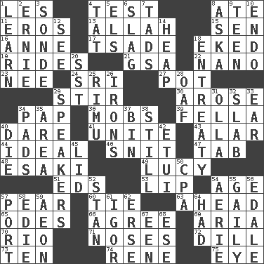 ACROSS 1. French article 4. Trial 8. Had dinner 11. Greek god of love 13. Assad's deity 15. Elected rep. 16. Queen of England 1702-14 17. Sadhe (variant) 18. Supplemented with great effort 19. Amusement-park features 21. Girls' org. (abbr.) 22. Billionth: prefix 23. Born 24. _ Lanka 27. Cooking vessel 29. Commotion 30. Came up 34. Infant food 36. Disorderly crowds 39. Man or boy (slang) 40. Have the gumption 41. Join together 43. Having or resembling wings 44. Perfect 46. In a ____ (agitated or irritated) 47. Bar bill 48. 1973 Nobel Price Winner (Physics) Leo 49. "I Love _" 51. Begley and Asner 53. Mouth edge 54. Personal question 57. Lightbulb-shaped fruit 60. Make a knot 63. At or in the front 65. Lyric poems 66. Match 69. Roberta Peters solo 70. River (Sp.) 71. Olfactory organs 72. Deli pickle 73. Nine, plus one 74. French philosopher Descartes 75. Sight organ DOWN 1. Memorize 2. Bert's buddy 3. Something which is sent 4. Make lace 5. Raised railways 6. Volcanic refuse 7. Bits 8. "____ silly question..." 9. Adolescent 10. Inside; within (prefix) 12. Observe 14. Pile 18. Plea 20. Fast jet (abbr.) 25. Tall New Zealand timber tree 26. Metal shackles 28. Clumsy lout 29. Orators 31. Spanish pot 32. Thick slice 33. Hearing organ 34. Writing tablets 35. Type of rug 37. Storage container 38. Free from disturbance or agitation 40. Pass on 42. Needle case 45. Hat (slang) 50. Tax preparer (abbr.) 52. Comedian Laurel of Laurel & Hardy 54. Nest on high 55. Lightheartedly 56. Peak District village in England 57. Sweet dark-red dessert wine 58. Singer Brickell 59. A really long time 61. Composer Stravinsky 62. Celtic language 64. Possessed 67. Car or cant ending 68. Compass dir.