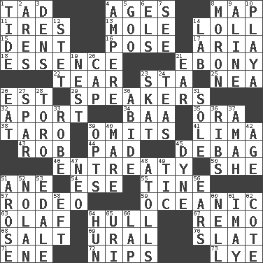 ACROSS 1. Bit 4. Ripens 8. Atlas unit 11. Angers 13. Undercover agent 14. Hang loosely or laxly 15. Gouge 16. Introduce or present, as a question 17. Roberta Peters solo 18. Center 21. Dark wood 22. Pull into pieces 23. R.R. building 25. Teachers' org. 26. Eastern Standard Time (abbr.) 29. Orators 32. To the left, to Queeg 34. Sound made by sheep 35. Mouth or opening 38. Pacific island yam 39. Leaves out 41. Pale green bean 43. Director Reiner 44. Writing tablet 45. Debunk (Brit. slang) 46. Plea 50. A female animal or person 51. A saturated hydrocarbon 54. Compass dir. 55. Prong on a fork 57. Cowboy competition 59. Pertaining to the sea 63. Norwegian king 64. Frame or body of a ship 67. San ____ (Riviera town) 68. Table seasoning 69. Mountain range 70. Narrow board 71. Compass dir. 72. Pinches, bites 73. Potassium hydroxide DOWN 1. Event that recurs at intervals 2. Ancient Greek god of war 3. Lairs 4. Electrical Unit 5. Thick or sticky substance 6. Raised railways 7. Perceive with the eye 8. Person of subnormal intelligence 9. Place in a line 10. Beach, in Buenos Aires 12. Proofreading order 14. Experiment locale 19. Egg locale 20. Head covering 21. Ewer handle 23. Three-handed card game 24. Afternoon social gatherings 26. Ingest 27. Practice fight 28. "Corrida" creature 30. Remain 31. Not divided or shared with others 33. Loose flowing garment 36. Chest bones 37. Wet nurse 39. Elects 40. Female horse 42. Grow older 45. Centimeter-gram-second unit of force 47. Modern: prefix 48. Ringlike coral islands and reefs 49. Nervous spasm 51. Came up 52. Pitcher Ryan 53. Peak District village in England 56. Hearing organs 58. Bank Draft (abbr.) 60. 1994 drama film starring Jodie Foster 61. "If ____ say so..." 62. ____ d'Azur (French Riviera) 64. Attila the _ 65. RI univ. 66. Infant locale
