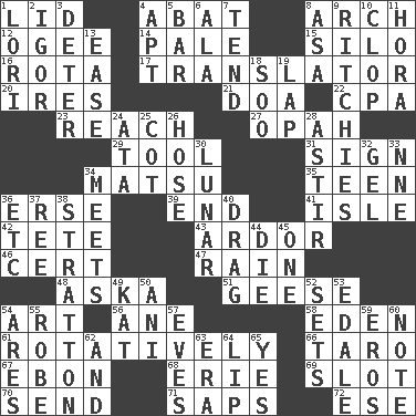 ACROSS 1. Hat (slang) 4. Blind as ____ 8. Bowlike part 12. Double curve, resembling the letter S 14. Light colored 15. Grain storage tower 16. Roll call or roster of names 17. Interpreter 20. Angers 21. ___ good deed 22. Tax preparer (abbr.) 23. Arrive at 27. Brightly colored fish 29. Instrument 31. Omen 34. Taiwanese island in East China Sea 35. Adolescent 36. Celtic language 39. Conclusion 41. Capri or Wight 42. False hair 43. Zeal 46. An absolute certainty 47. Precipitation 48. "____ silly question..." 51. Honkers 54. Tate display 56. One (Scot) 58. Paradise 61. Producing rotation 66. Pacific island yam 67. Inky black, to poets 68. One of the Great Lakes 69. Narrow, elongated depression 70. Post 71. Plant excrements 72. Compass dir. DOWN 1. Australian parrot (variant) 2. Composer Stravinsky 3. Prevent from occurring 4. Fitting 5. Drinking establishment 6. In the manner of 7. Watch over 8. White ___ sheet 9. Actors Guy, Robert Welles, and Clint 10. Hoof sound 11. Israeli folk dance 13. Comfort 18. "Barney Miller" actor Jack 19. Infant locale 24. "One Day ___ Time" 25. Small bed 26. Flexible conduit 28. Being in motion 30. Type of eclipse 32. Set 33. Compass dir. 34. Confronts 36. And so on (abbr.) 37. To riddle 38. Ski resort town in Vermont 40. To draw with force 44. Pass on 45. Single 49. Krazy ___ of comics 50. Cuckoo 52. Arranges properly for use 53. Peak District village in England 54. Ancient Greek god of war 55. Loose flowing garment 57. Nights before holidays 59. Greek god of love 60. Brief written record 62. Plus 63. Period 64. Mouth edge 65. Consenting reply