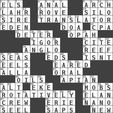 ACROSS 1. Raised railways 4. Of or related to the anus 8. Bowlike part 12. Cowardly lion portrayer 14. Be footloose 15. Grain storage tower 16. The founder of a family 17. Interpreter 20. Locale of original sin 21. ___ good deed 22. Accounting whiz (abbr.) 23. Prevent from occurring 27. Brightly colored fish 29. Composer Stravinsky 31. Quote 34. White American of non-Hispanic descent 35. Coral ridge 36. Oceans 39. Begley and Asner 41. Is not 42. Snakelike fish 43. Having ears or earlike features 46. Silent film actress Nazimova 47. Relating to the mouth 48. Petroleums 51. Bee-related 54. The first octave above the treble staff 56. Supplement with great effort 58. Disorderly crowds 61. Happening in regular succession 66. Enthusiasm 67. Ship's personnel 68. 4th largest of the Great Lakes 69. Billionth: prefix 70. Sew up the eyelids of hawks and falcons 71. Plant excrements 72. ___ Haven, CT DOWN 1. Otherwise 2. Put down 3. Tear up 4. Tate display 5. Not either 6. Actress Gardner 7. Grant temporary use of 8. White ___ sheet 9. Actors Guy, Robert Welles, and Clint 10. Hoof sound 11. Israeli folk dance 13. French philosopher Descartes 18. "Barney Miller" actor Jack 19. Infant locale 24. Metal container 25. Oval reproductive body of a fowl 26. Hero or heavy, e.g. 28. Sour-tasting 30. Cowboy competition 32. Nine, plus one 33. Lizard (obsolete) 34. Slender Brazilian palm 36. Ocean 37. Snakelike fish 38. One to whom something is allotted 40. "Two Mules for Sister ____" 44. Reproach for some lapse or misdeed 45. Biblical high priest 49. Allow 50. What Jean-Claude Killy likes to do 52. So be it 53. Pitcher Ryan 54. Arches 55. Old wives' tales, e.g. 57. Nights before holidays 59. Object of repulsion 60. Frozen precipitation 62. Leather borer 63. Epoch 64. Mouth edge 65. It is so